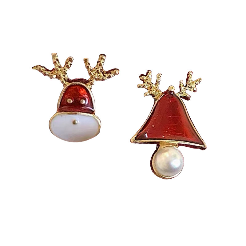 "Elk and Bells" Christmas and New Year red, white cute deer bells, pearl red ear pins, ear clips
