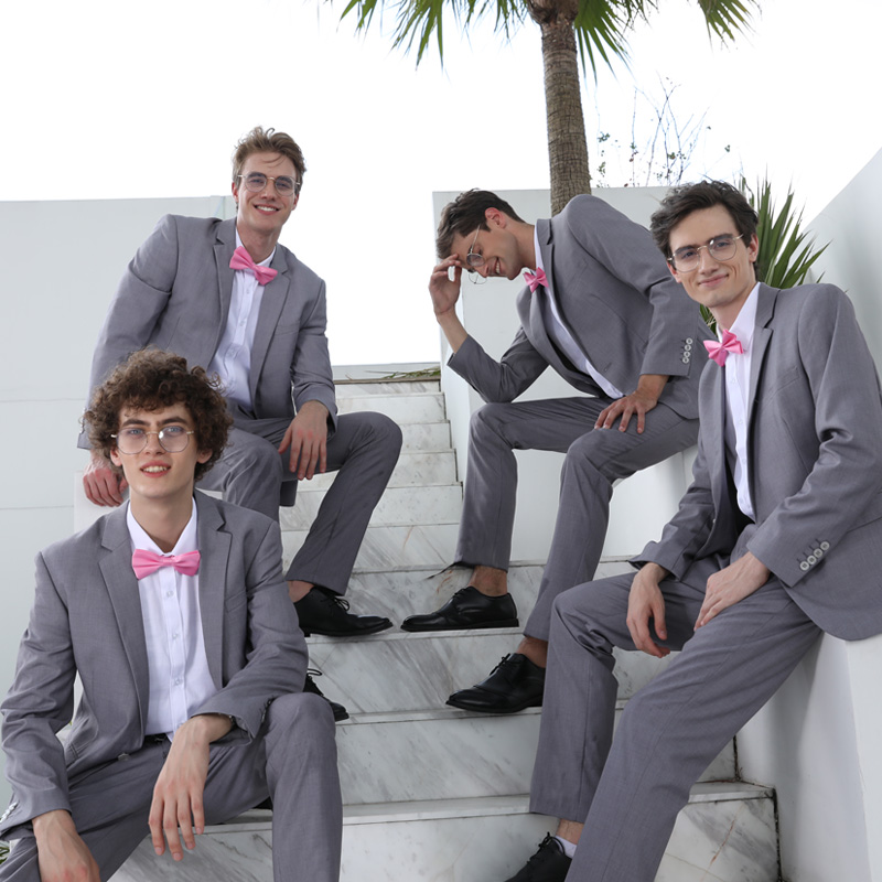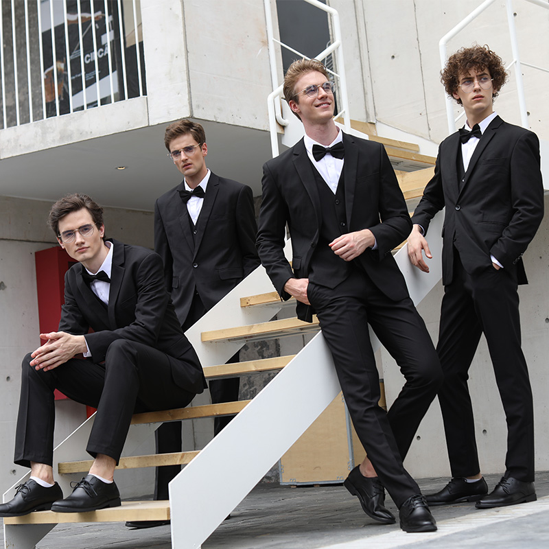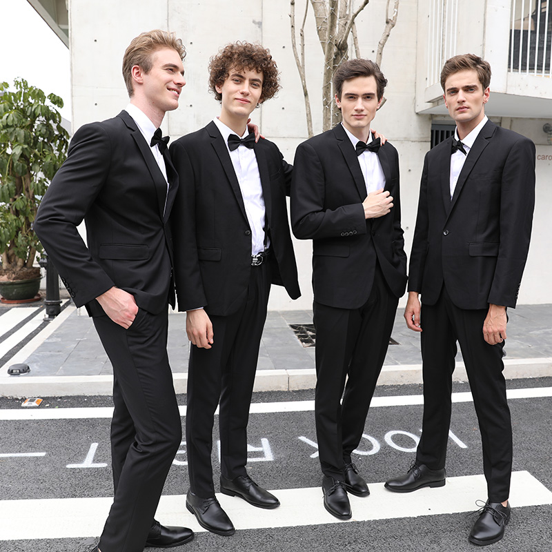 black jacket shirt black long pants black collar tie blue jacket shirt blue long pants black collar knots grey jacket shirt grey long pants pink collar knots black jacket horse chia shirt black long pants black