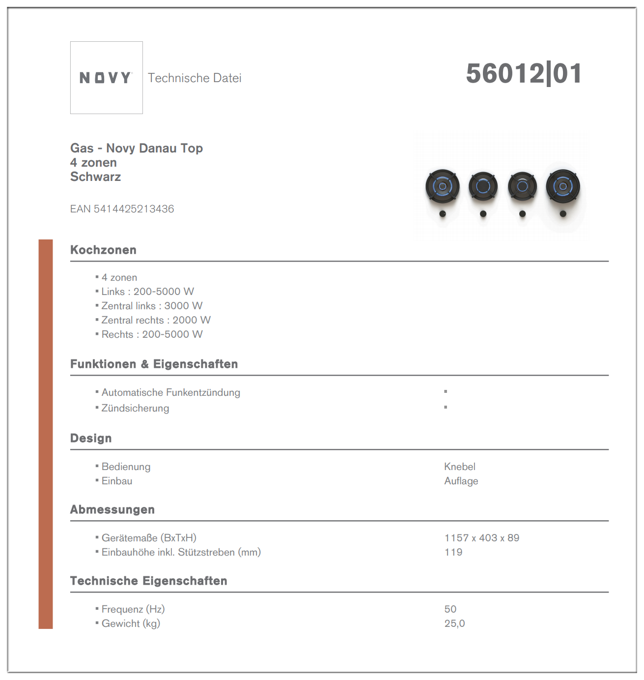 Novy Novy Danau Top 56012 countertop embedded 4-eye gas stove imported from Germany