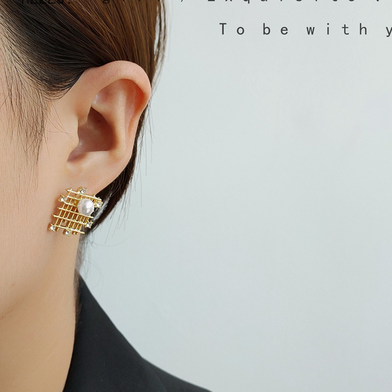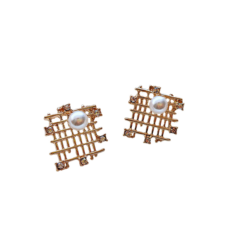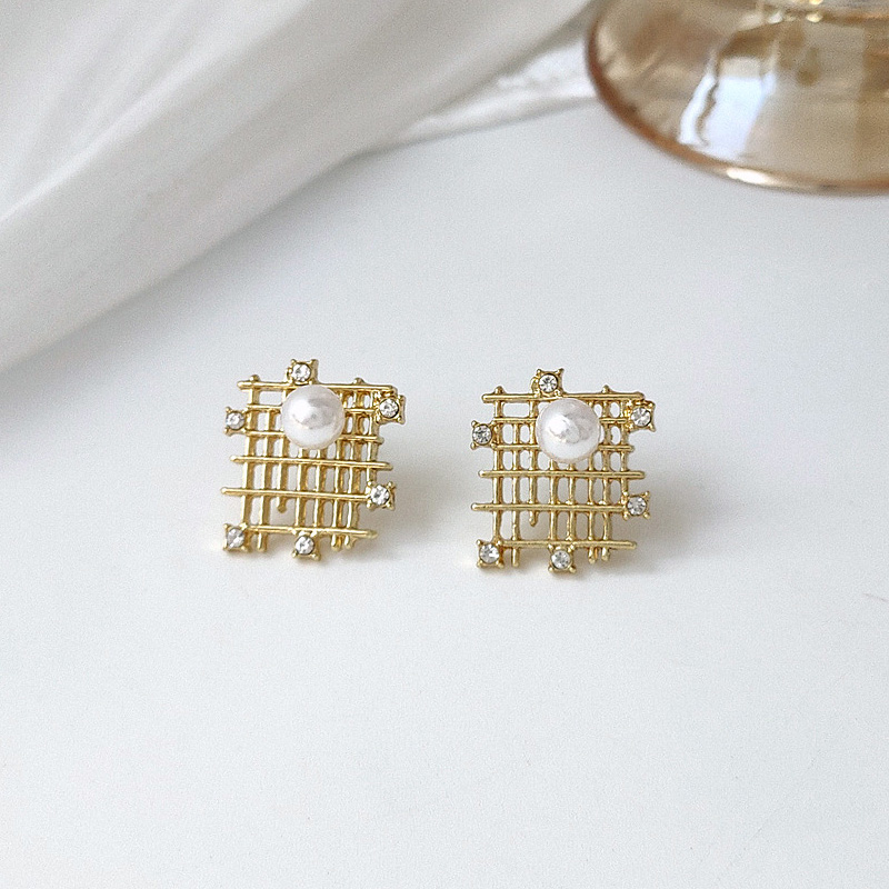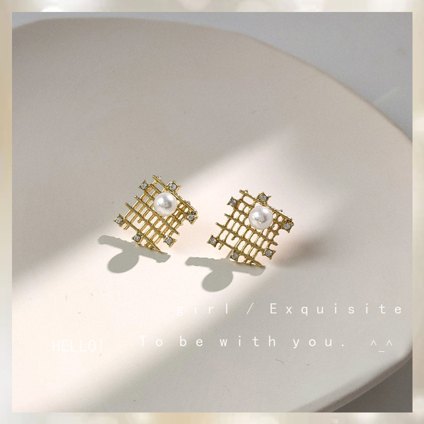 Diamond pearl earrings temperament personality mesh hollow ear pin female fashion niche creative irregular all-match earrings - Taobao