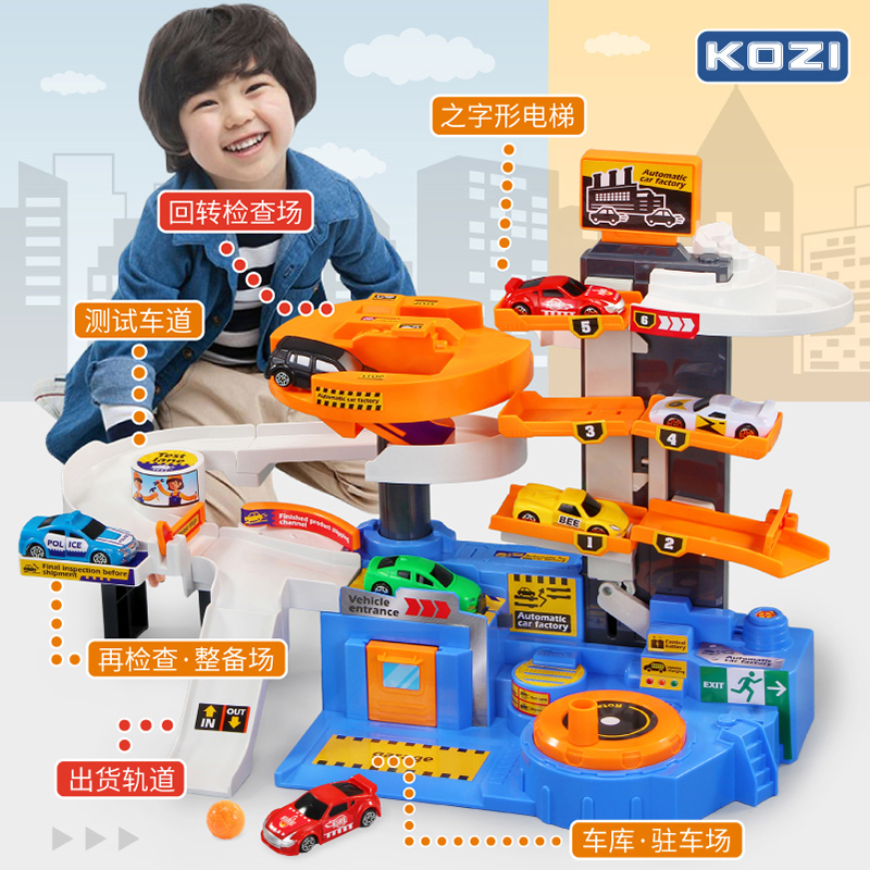 Children's car factory rotating lifting track pearl tower tunnel shaking sound children's toy parking lot boy