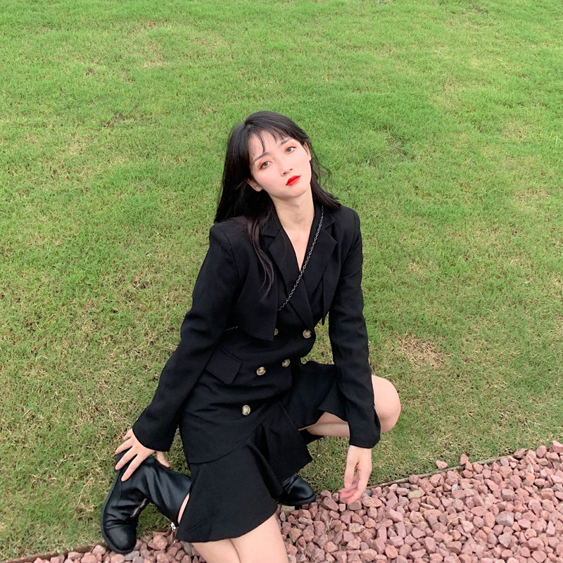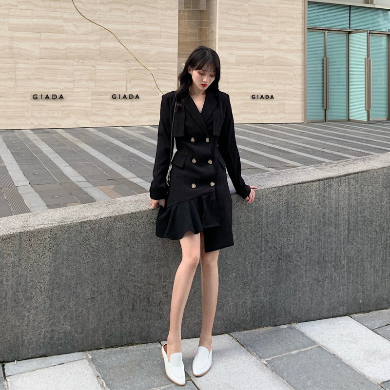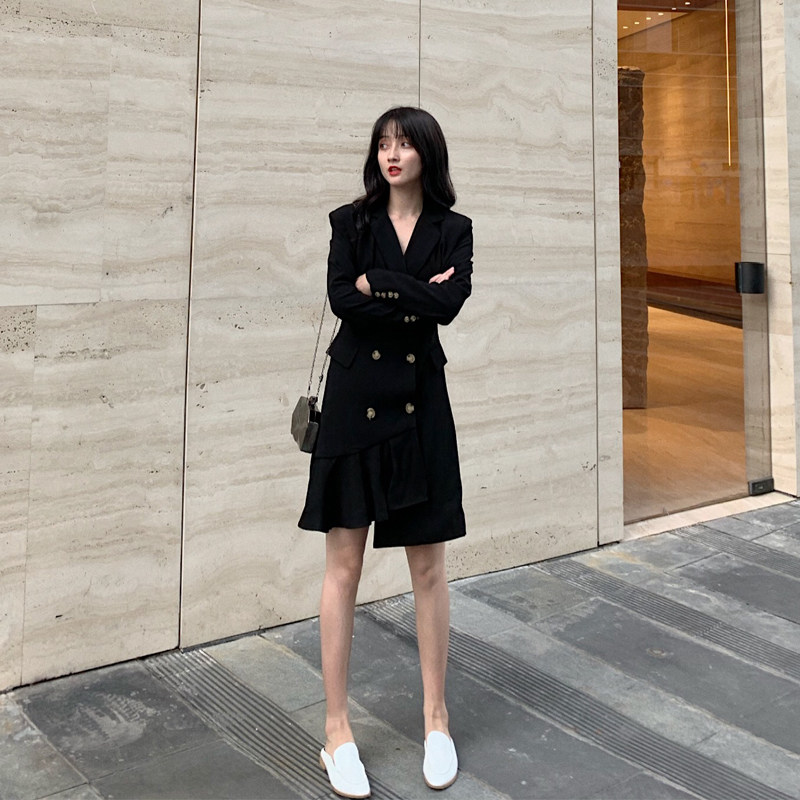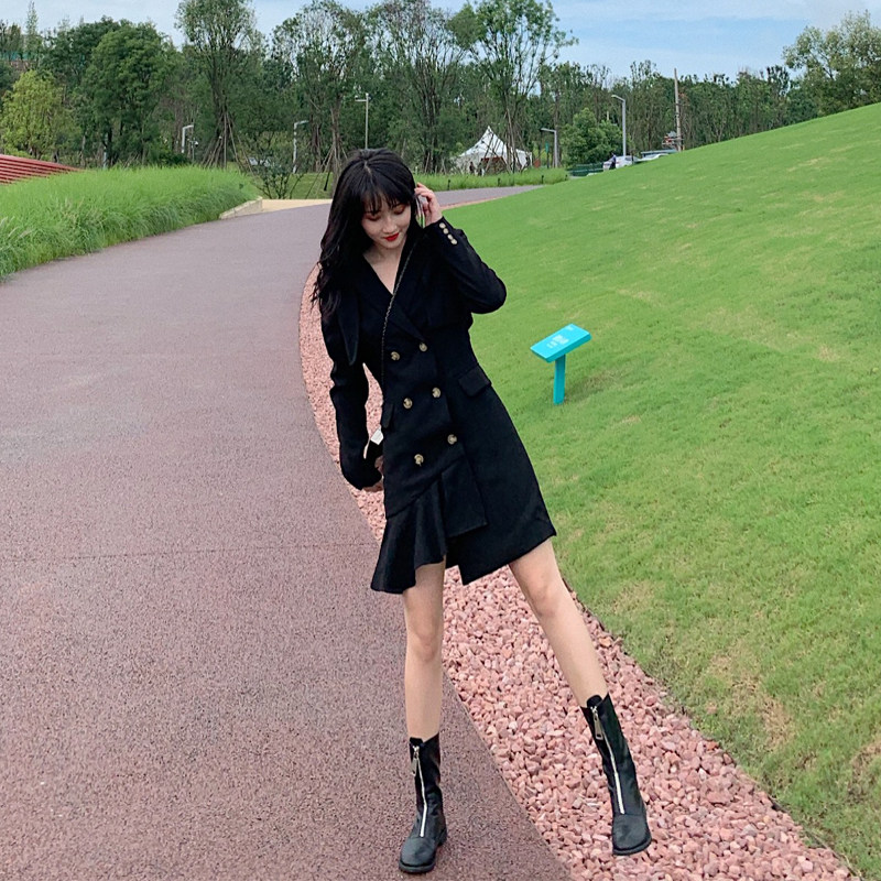 Little black dress asymmetric chic Hong Kong style mid-length shoulder pad suit dress design sense first love temperament autumn and winter