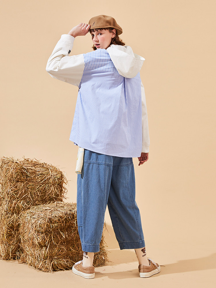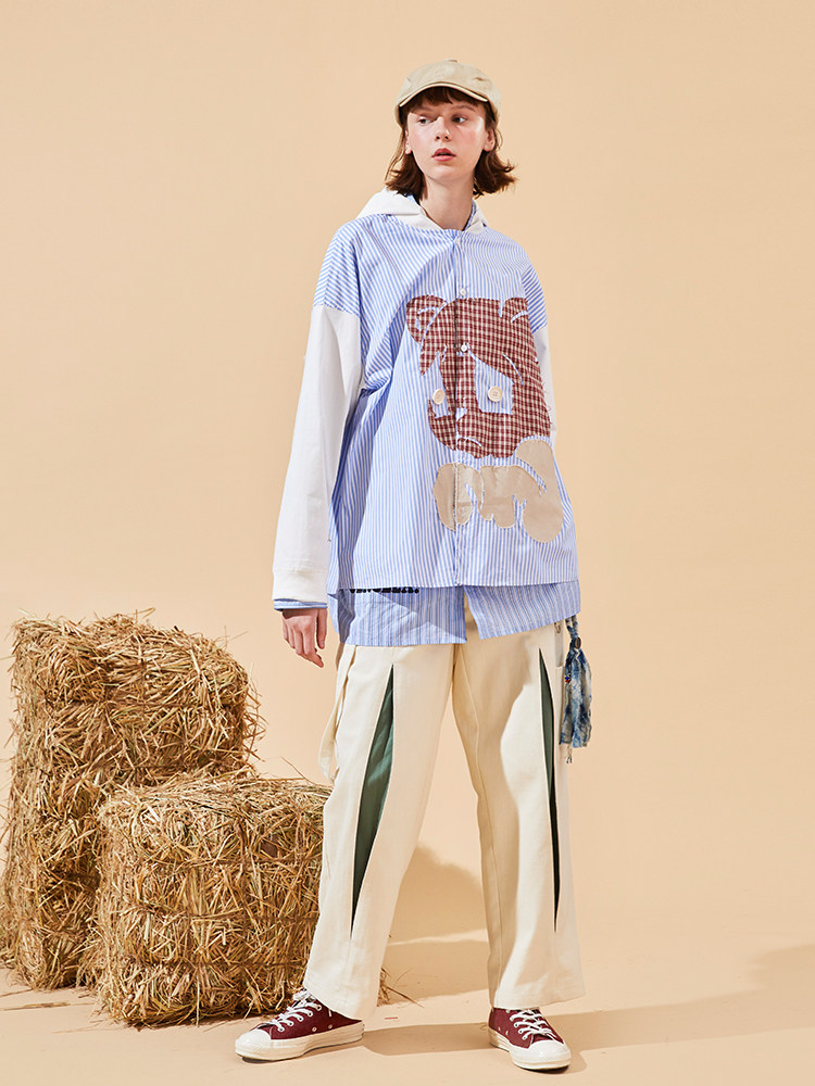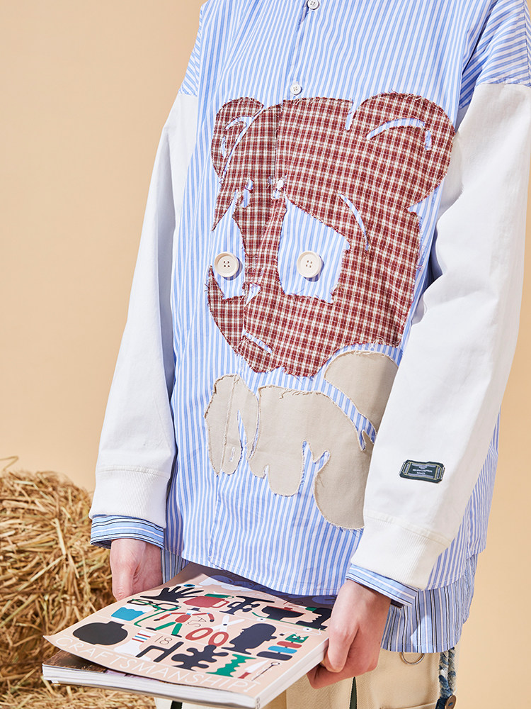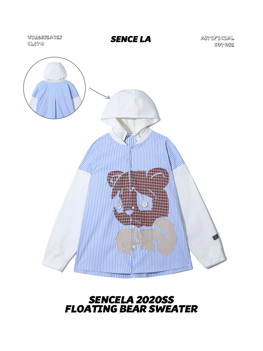 SENCE LA bear print blue striped shirt men's detachable hooded loose trendy brand stitching long-sleeved jacket