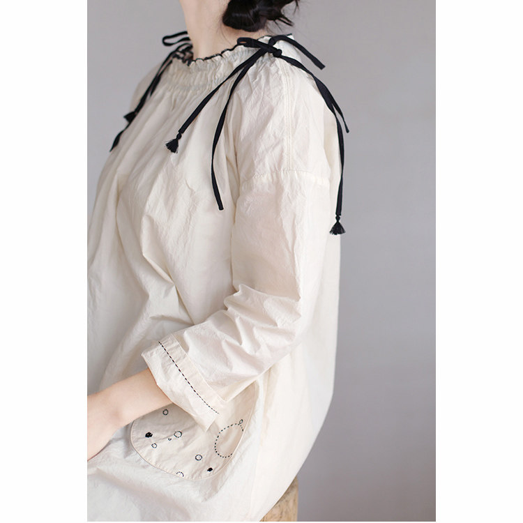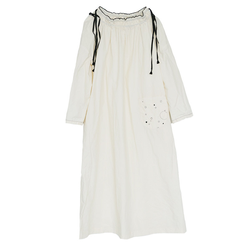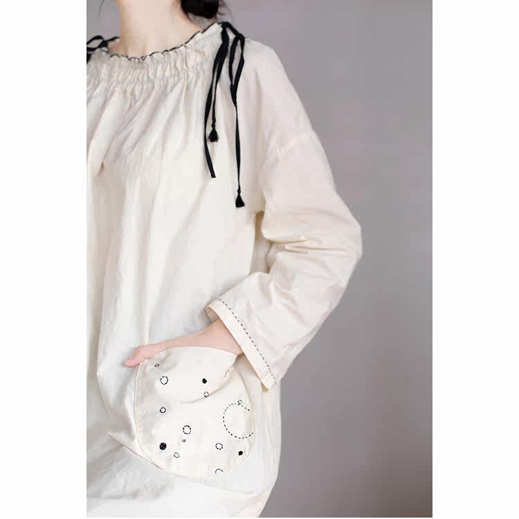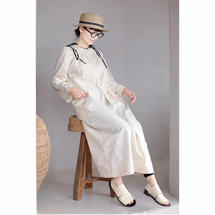 An old original spring linen cotton blended cheese white black lace collar hand embroidered loose dress 3315