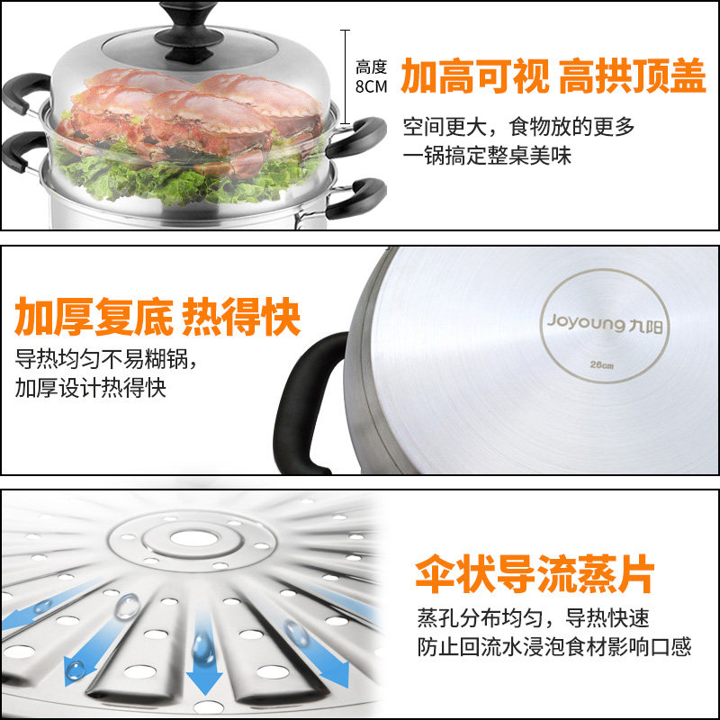 Jiuyang steamer household 26cm stainless steel steamed steamed buns large capacity three-layer cooking pot gas stove steamer ZGH2601