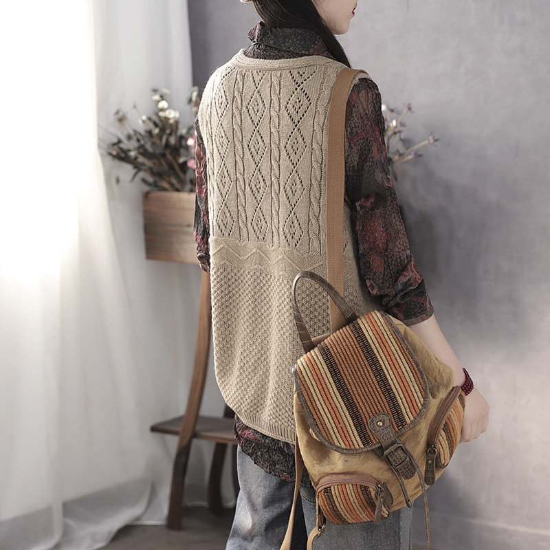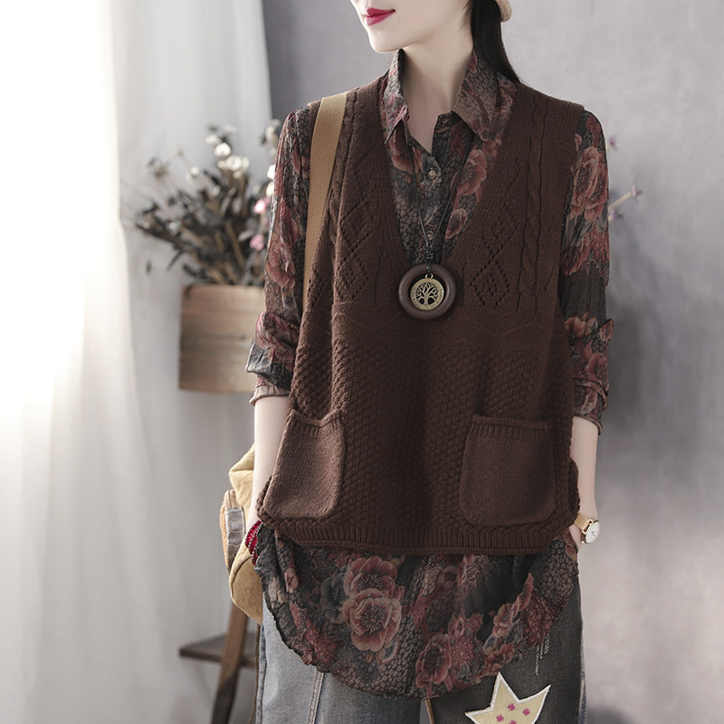 Han Soyi retro art Spring wool vest female outwear loose V collar double pocket Knitted Sweatshirt