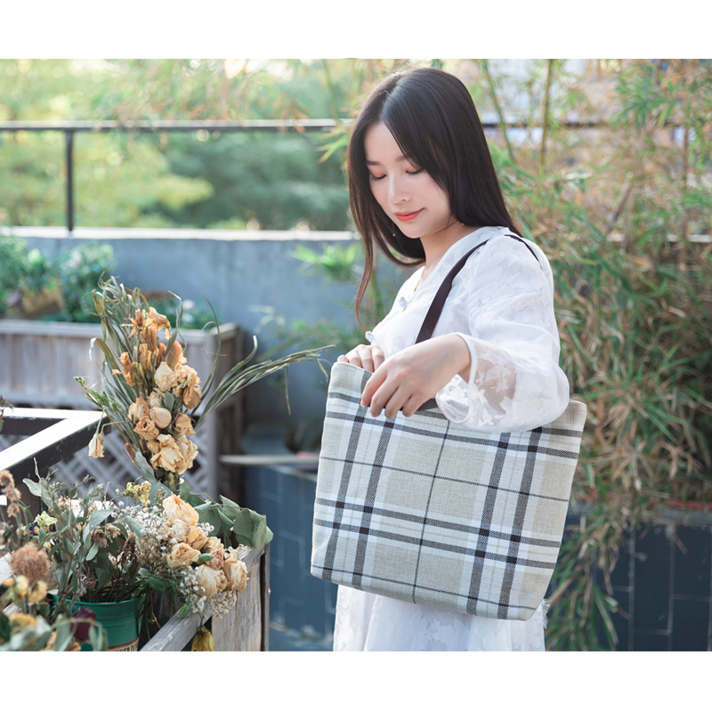 Original manual design cotton linen cloth bag women's large capacity Joker classic plaid student tote canvas shoulder bag