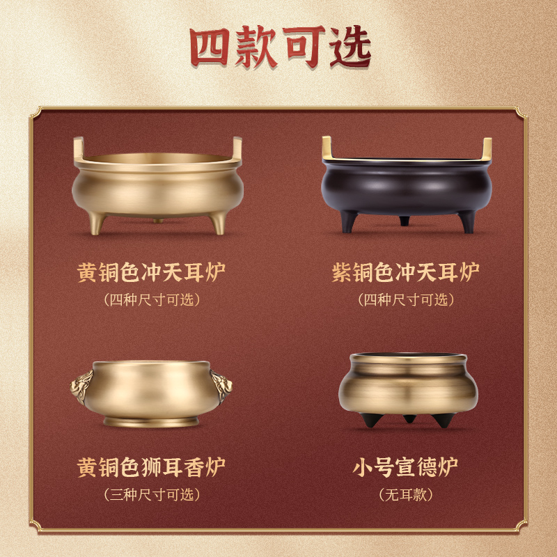 Weighted version - Small copper (diameter approx. 10cm * height 5.5cm) Weighted version - Medium Copper (diameter approx. 12cm * height 6.5cm) Weighted - Large copper (diameter approx. 15cm * height 8cm) + sands Emphasis - Oversized copper (diameter approx. 20cm * height 10.5cm) + gold sand * 2 Emphasis - Small brass (diameter approx. 10cm * height 5.5cm) Aggravated - Medium brass (diameter approx. 12cm * height 6.5cm) Weighted version - large brass color (diameter approx. 15cm * height 8cm) + sands Accented version - Oversized brass color (diameter approx. 19.7cm * height 10.5cm) + golden sand * 2 Large lion's ear incense burner + copper gourd + 9 hole incense sticks + Australian sandalwood 20g Bing xiang (about 500 smokeless sandalwood types) + Cupola S + Jinyu Mingsha BingXiang (about 500 smokeless sandalwood types) + Cupola ear medium + Jinyu Mingsha Xianjia Blessed Incense (about 500 smokeless sandalwood types) + Cupola large + Jinyu Mingsha*2 In and out of Ping An Incense (about 500 smokeless sandalwood types) + Cupola Large + Jinyu Mingsha *2 Xianjia Blessing Incense (about 500 smokeless sandalwood types) + Cupola Large + Jinsha *2 Medium Xuande Furnace (Earless Model) + 9 Hole Incense Sticks Small Xuande Stove (Earless Model) + 9 Holes Incense Sticks BingXiang (about 500 Smokeless Sandalwood Types) + Medium Xuande Furnace + Jinyu Mingsha Mini Cupola Ear Incense Burner (Diameter approx. 7.5cm * Height approx. 4cm)