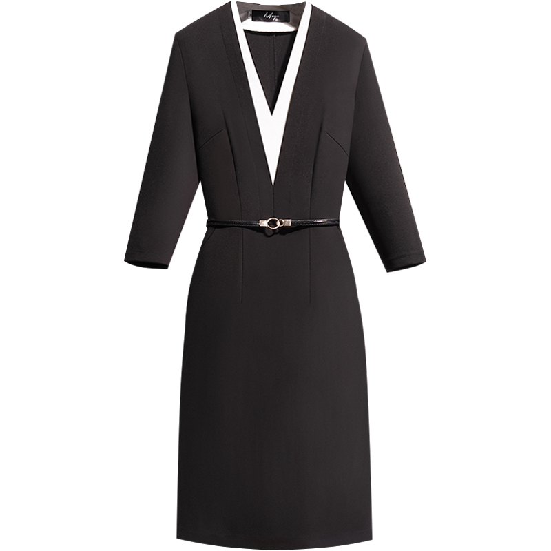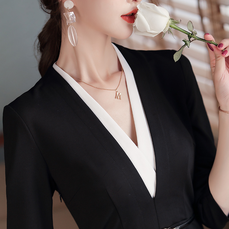 Foreign dress collection waist display slim temperament V collar workout slim black to work with light ripened wind bag glutes 50% sleeves skirt