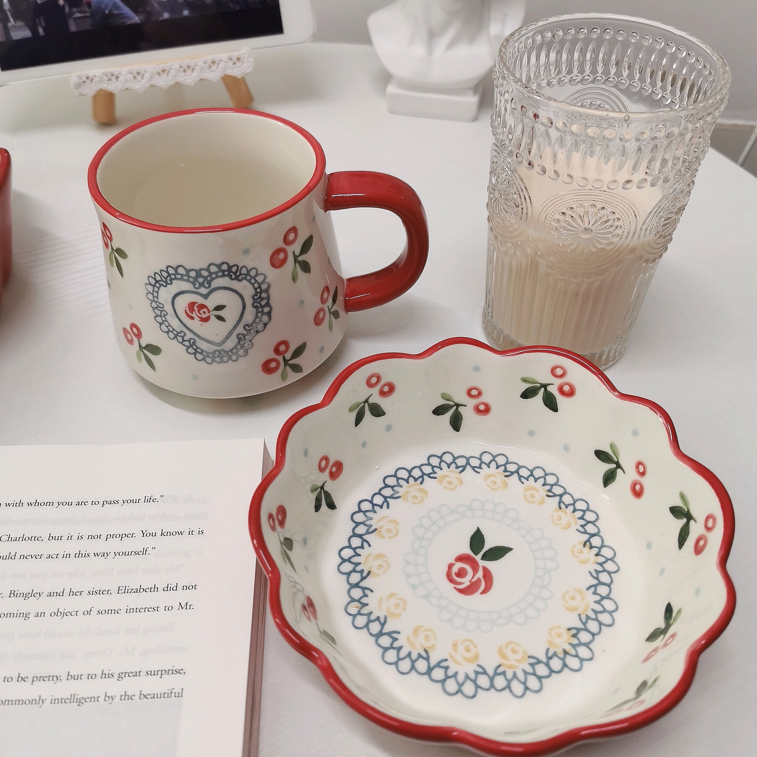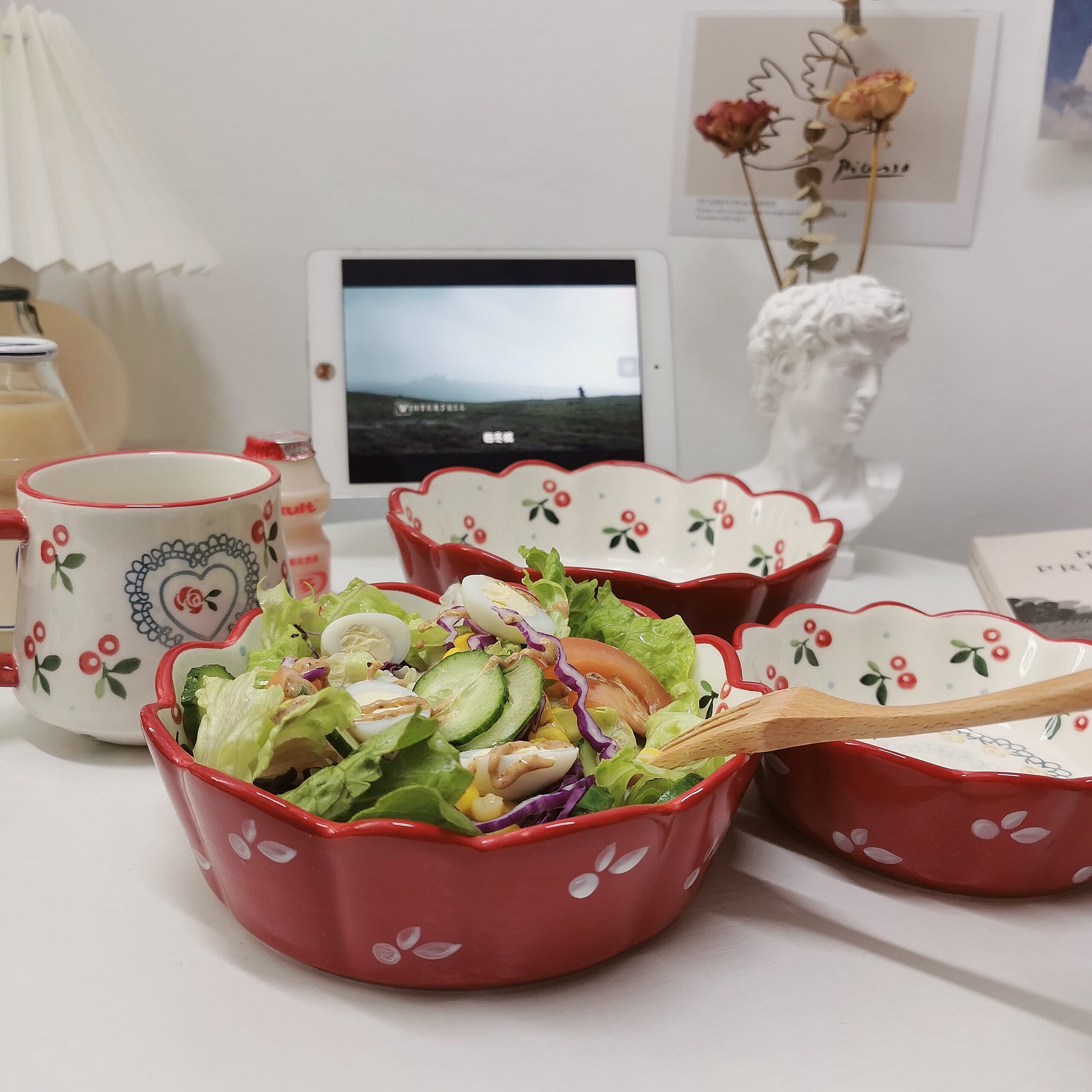 *Pretty Little Aunt* Red Cherry Vintage Lace Bowl Japanese Ceramic Cute Salad Bowl Coffee Cup Couple Cup