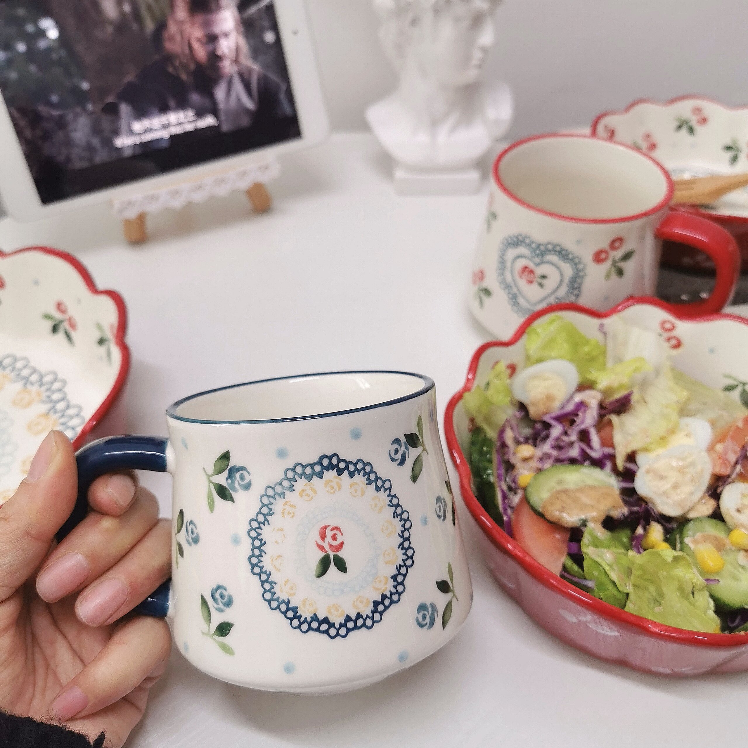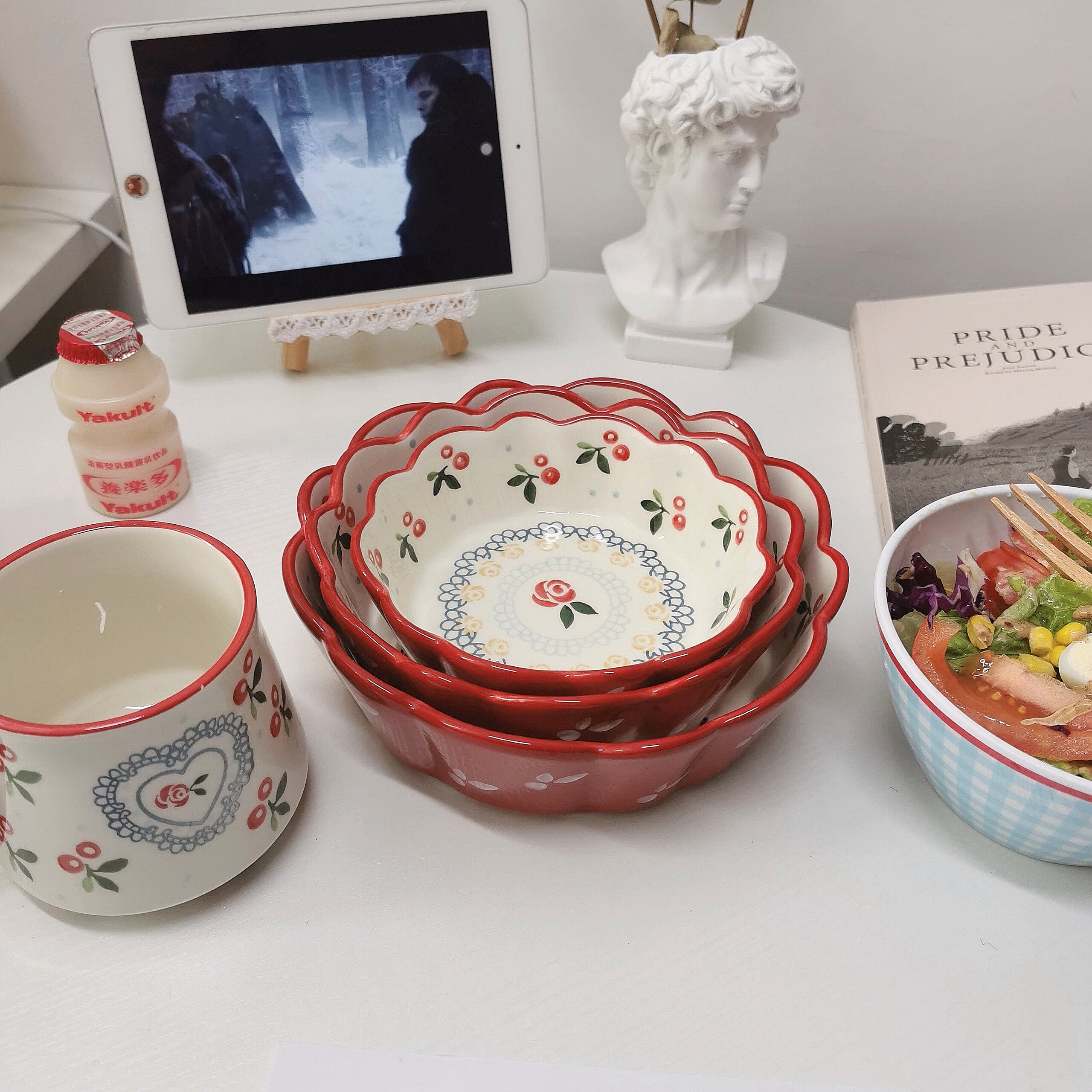 6 inch bowl 7 inch bowl 8 inch bowl red cherry milk tea cup blue cherry milk tea cup