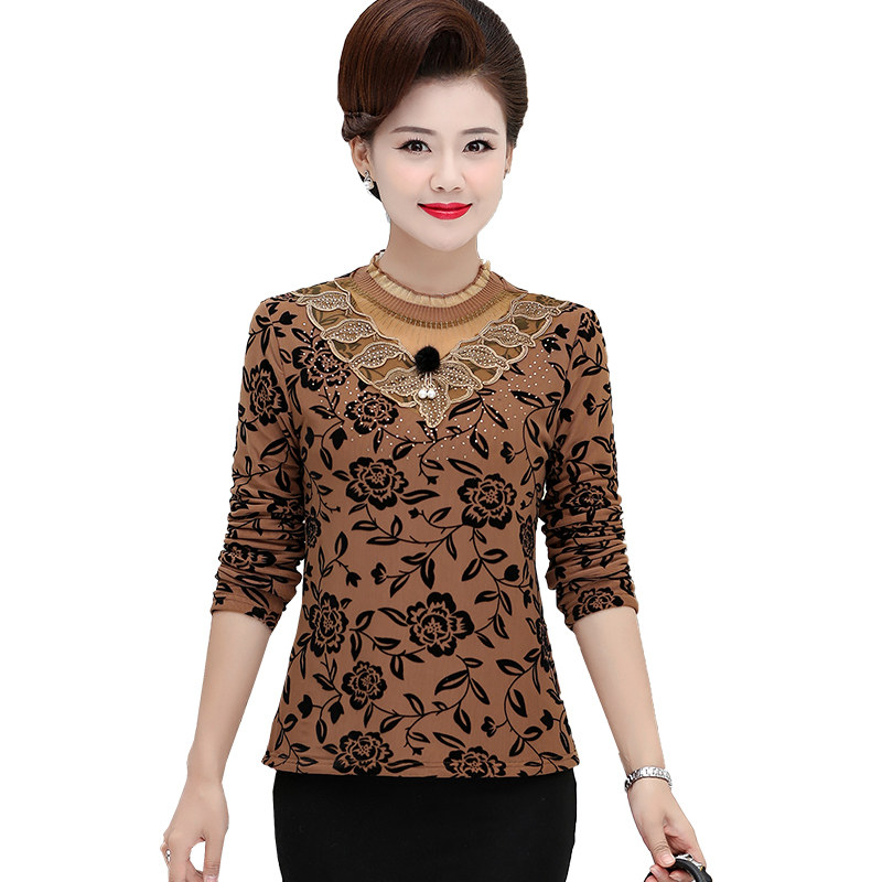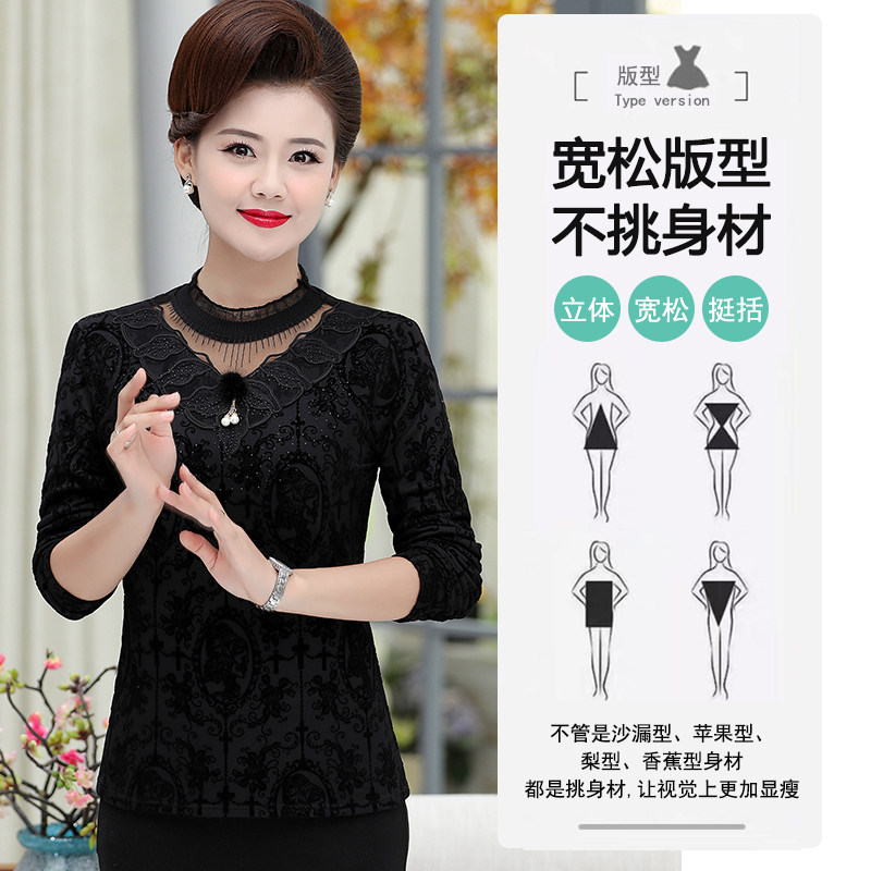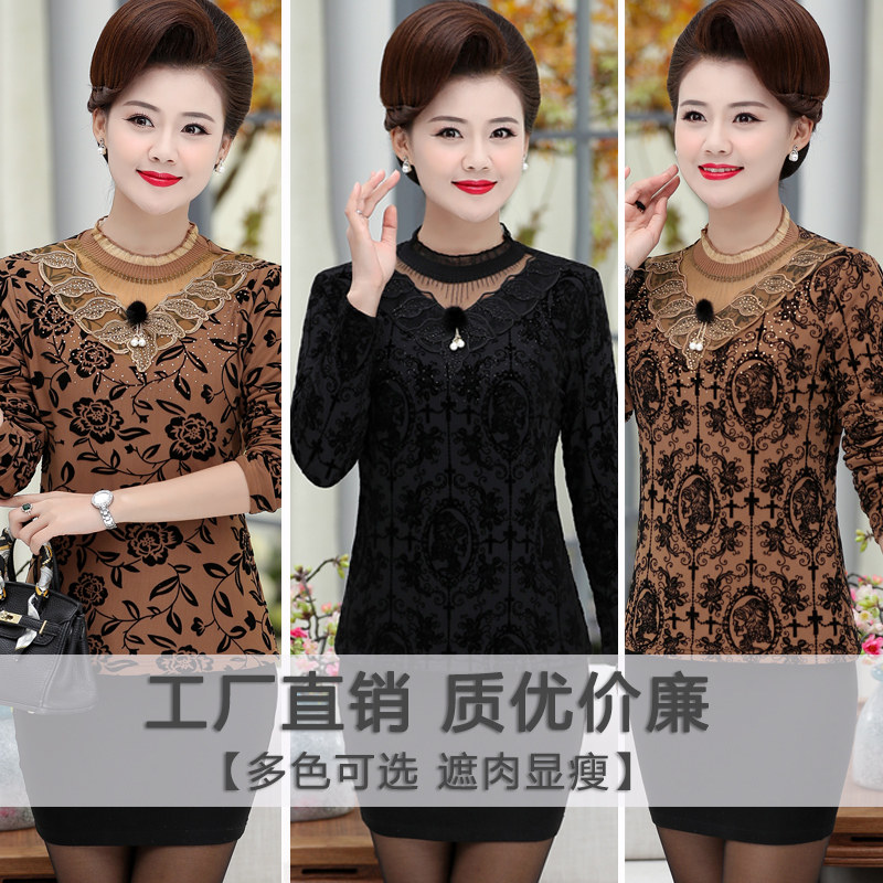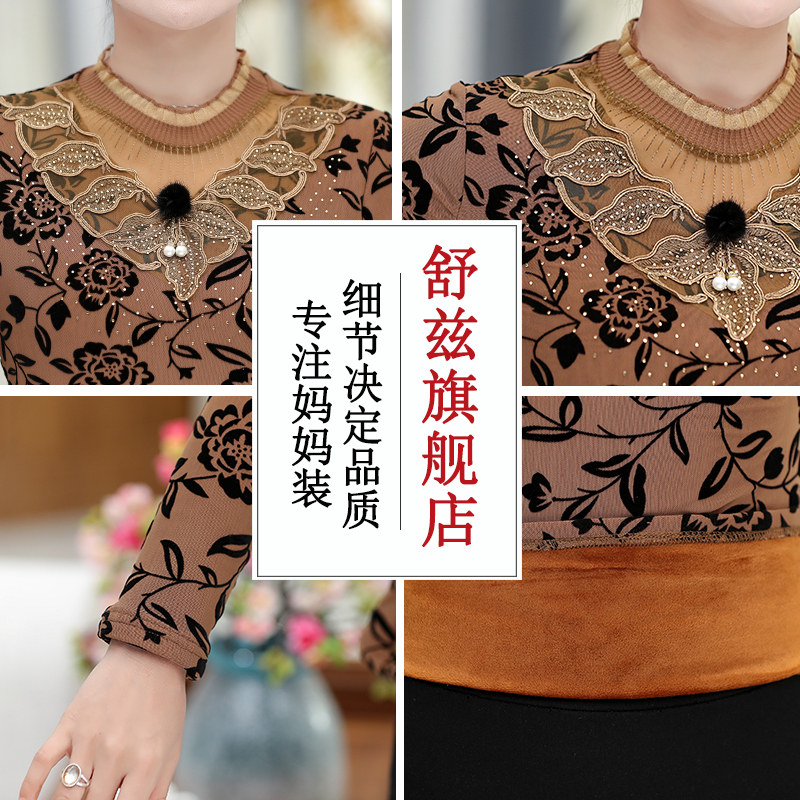 Mother's autumn and winter dress long-sleeved plus velvet bottoming shirt short middle-aged and elderly women's lace t-shirt western style small shirt thickened top