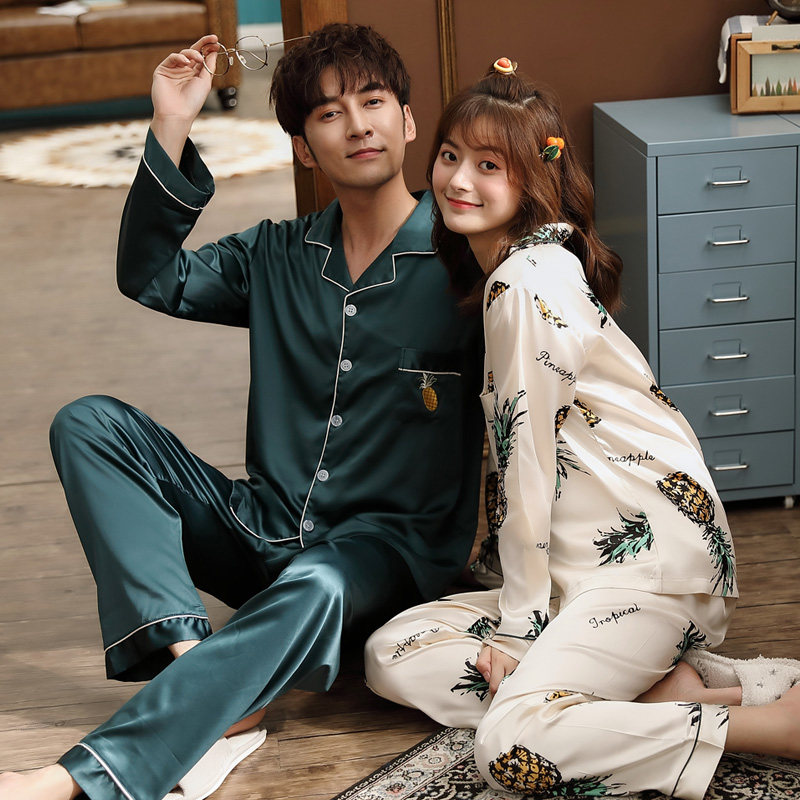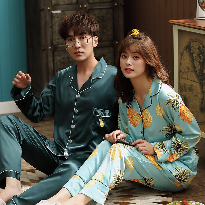 2 sets price lovers sleepwear spring and autumn summer style ice silk long sleeves men's thin female emulated silk Home Suits Pineapple