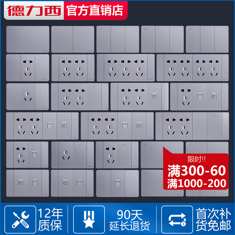 Delixi 118 type silver switch panel household gray four-bit row 12 twelve holes 20 twenty holes socket 9