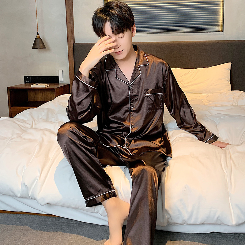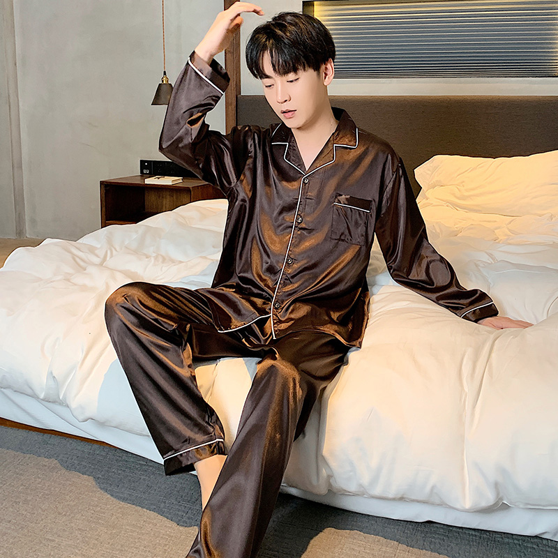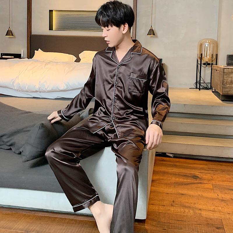 Men's pajamas spring and autumn long-sleeved trousers ice silk thin suit men's solid color trendy fashion personality silk two-piece suit