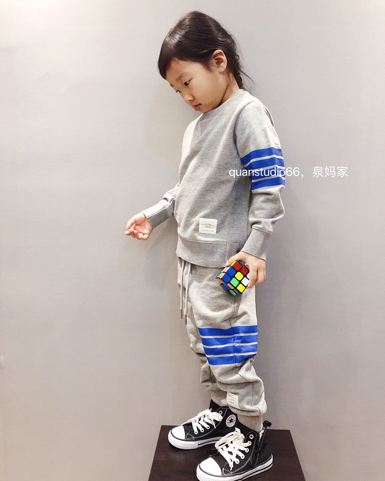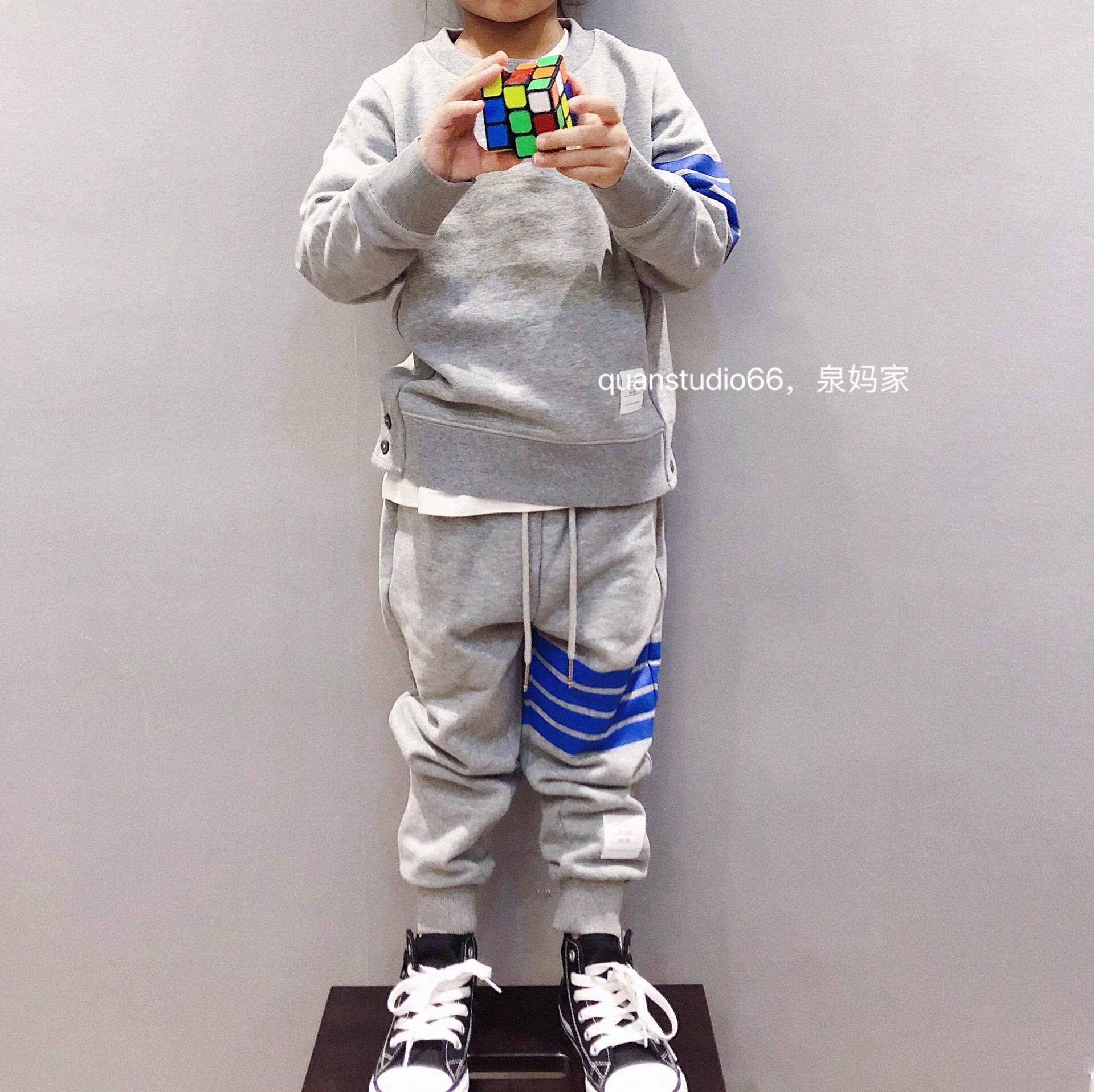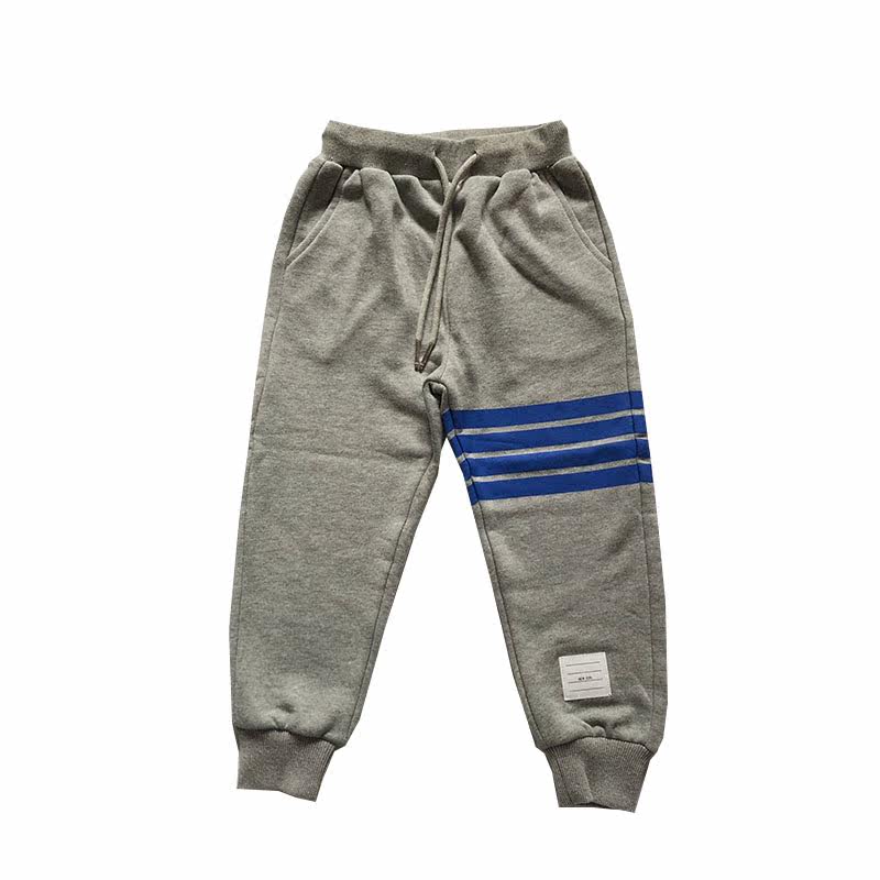 Wellspring Home Children Japan-ROK casual thick cotton sweatpants pure cotton wool ring temperament Grey blue Four bars Campus Sports Pants