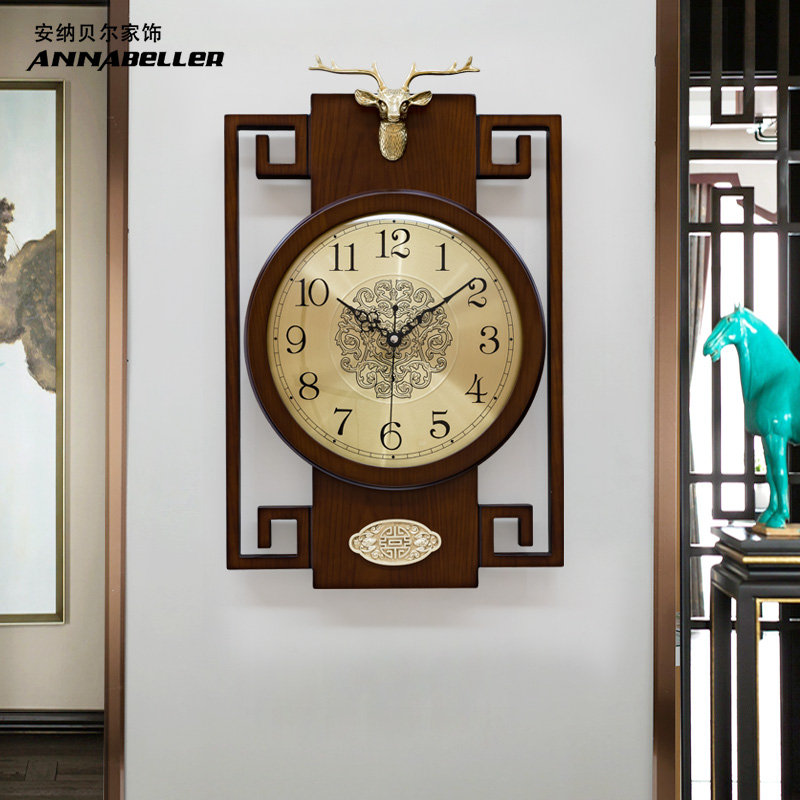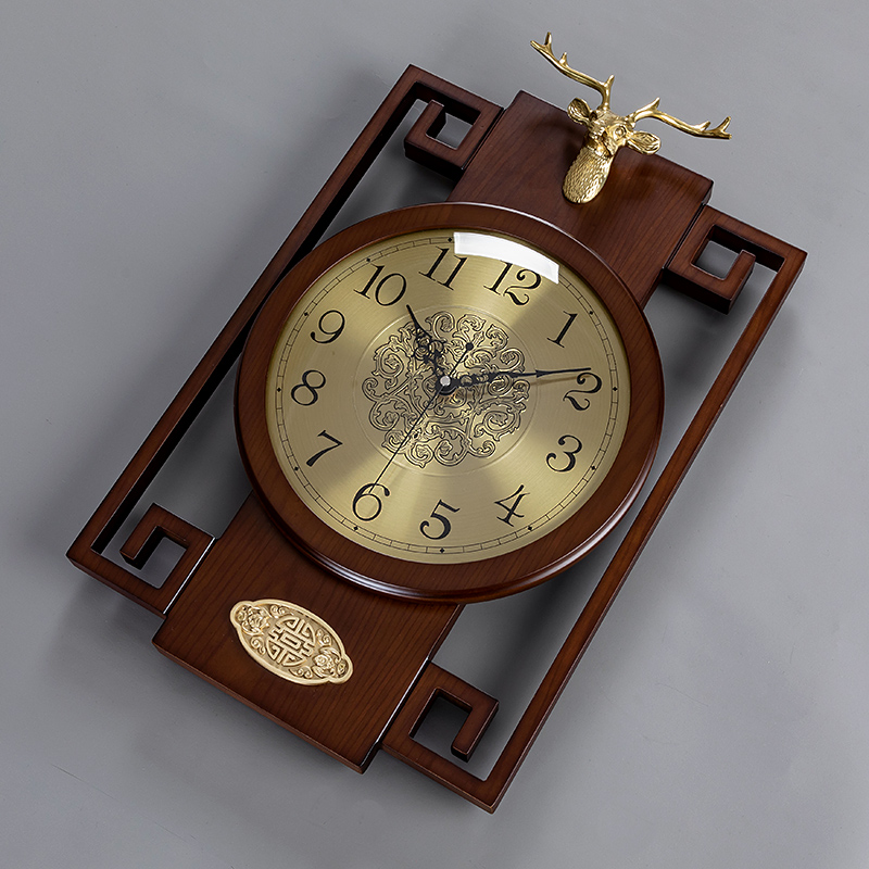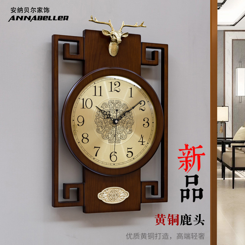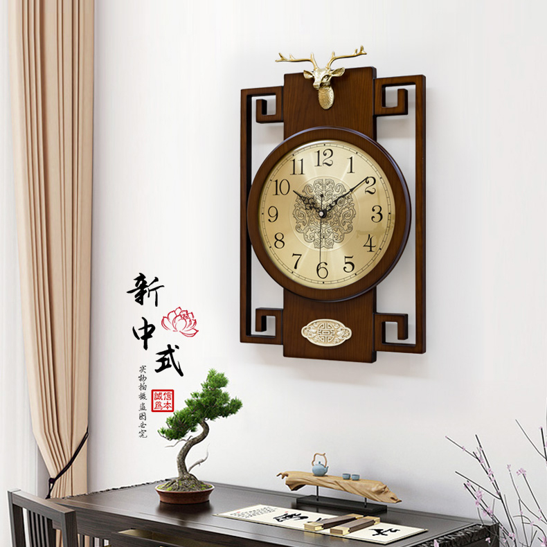 New Chinese style solid wood wall clock Living room mute creative deer head wall clock Household Chinese style atmospheric decorative clock