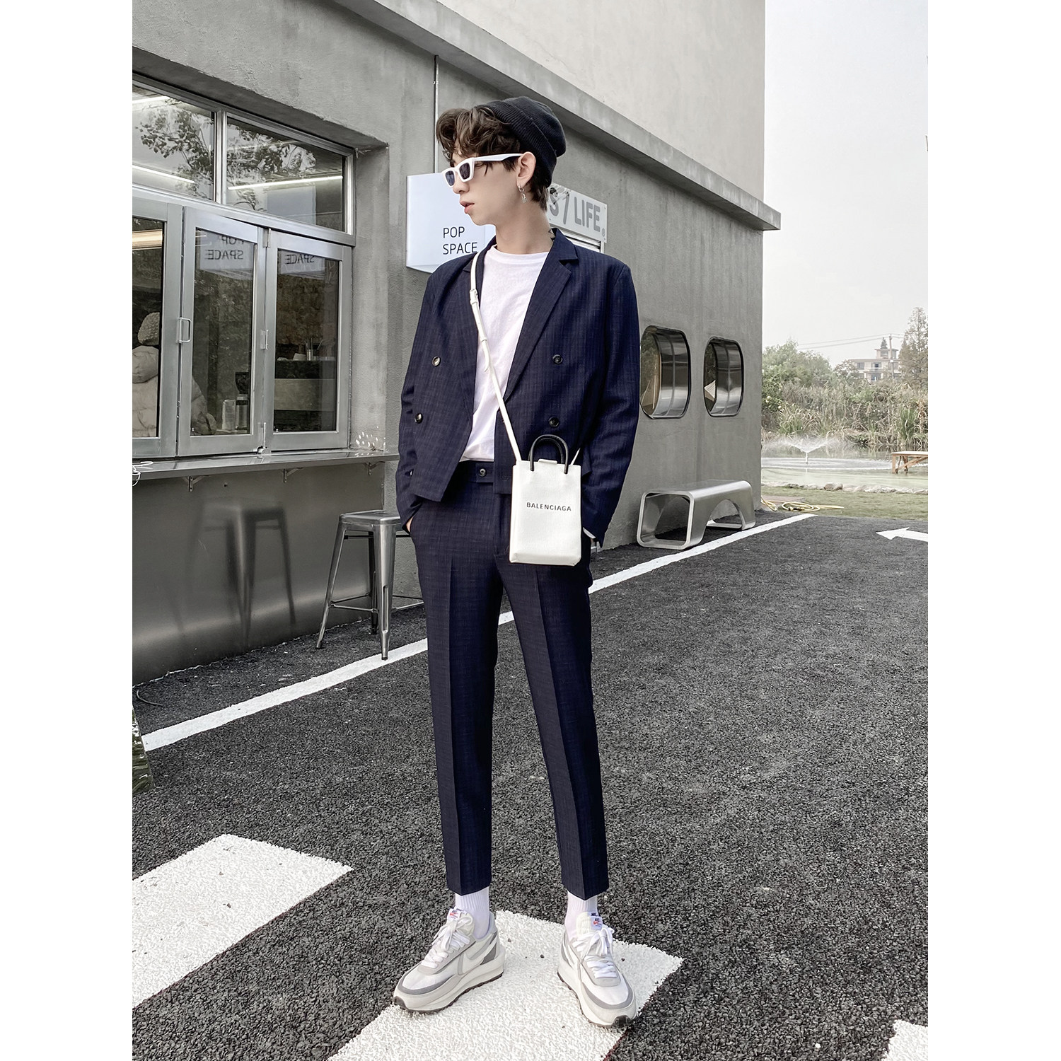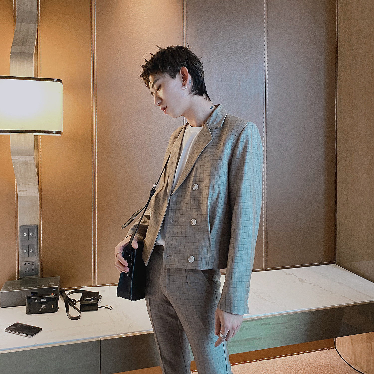 Short double-breasted suit for men Korean version slim fit suit set boys vintage plaid casual workwear two-piece set
