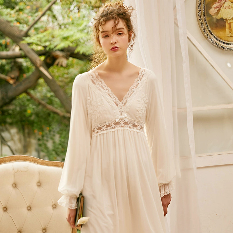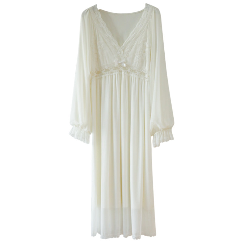 Dust-Hee Original Retro Sleeping Dress Spring Autumn Long Sleeve Deep V Sexy Hollowed-out Lace Mesh Veil Modale Stay-at-home Pyjamas