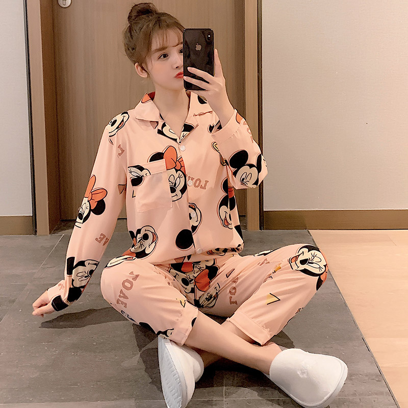 Spring and Autumn pajamas Women's cute ice silk long sleeve Princess style loose student thin cotton silk summer home suit set
