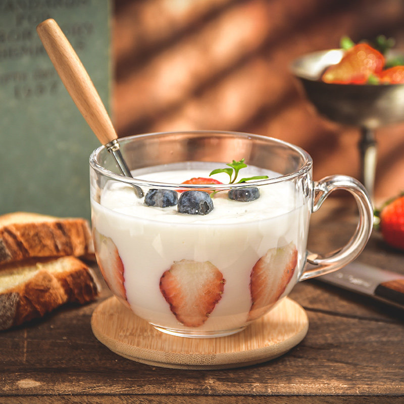 2 transparent breakfast cups, wooden lid, wooden handle spoon