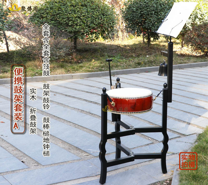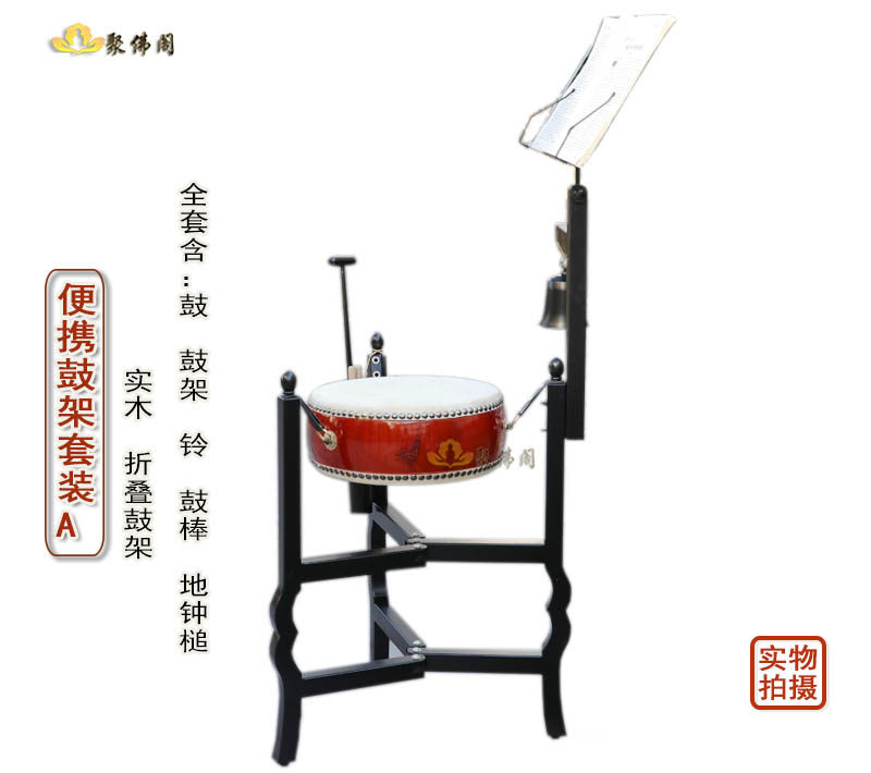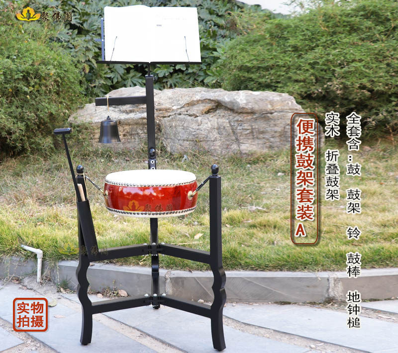 Buddhist instruments Cowhide drum Buddhist drum Cowhide flat drum Taiwan solid wood three-legged flat drum Tambourine 14 inch Buddha Hall dharma drum