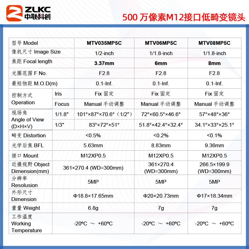 Focal length 3 37mm (MTV035MP5C) focal length 6mm (MTV06MP5C) focal length 8mm (MTV08MP5C) focal length 12m