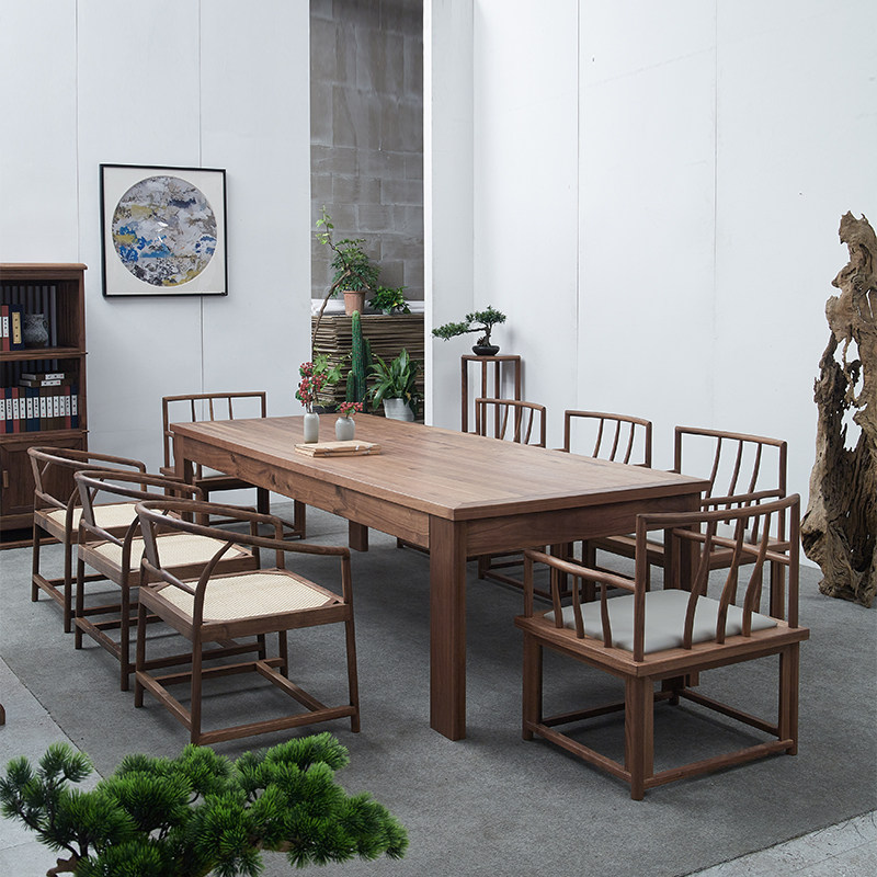New Chinese style tea table and chair combination conference table Zen simple modern black walnut solid wood large tea table large rectangle