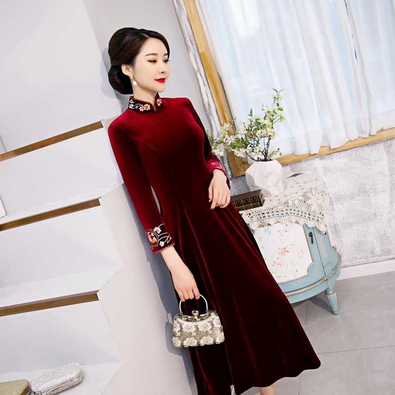 Wedding moms 2022 new Korean suede Embroidery Improved Qipao Skirt the wedding party will dress the wine gown.