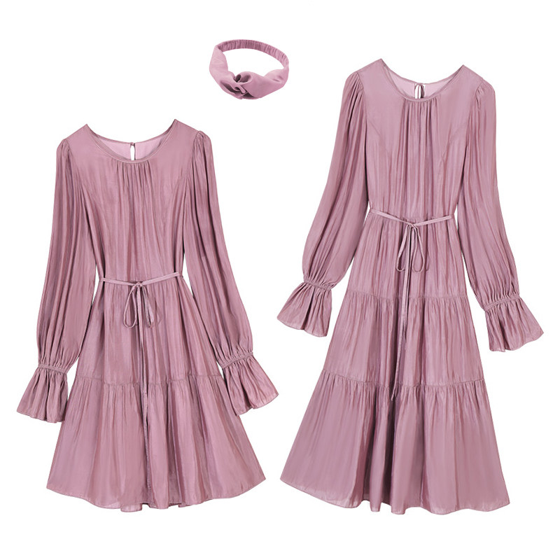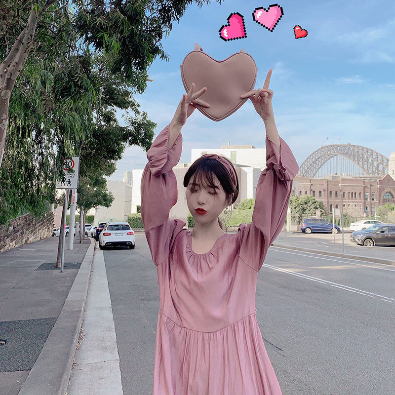 (Spot Flash) Great Joy Spring Summer Round Collar CHIC Glossy Lace Long Sleeve Foreign Dress Female Superfairy Slim Fit