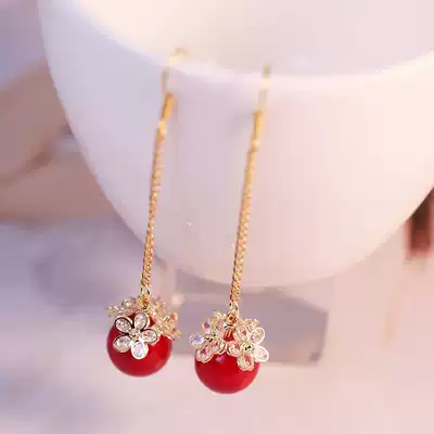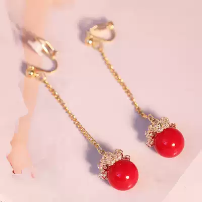 High-end red pearl flower ball earrings Korean temperament net red big round face ear clip no pierced ears female face thin ear needle