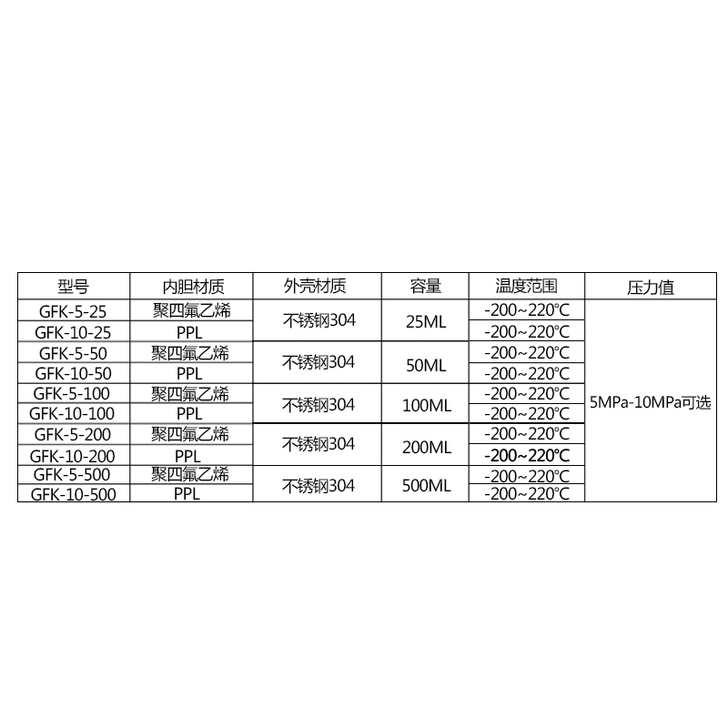 GFK-5MPa-25ml PTFE GFK-5MPa-50ml PTFE GFK-5MPa-100ml PTFE GFK-5MPa-20