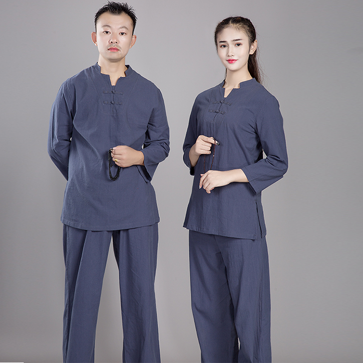 Buddhist lay clothes Chinese plate buckle monastery volunteer clothes Buddhist cotton and Hemp vegetarian clothing Practice clothes set custom logo