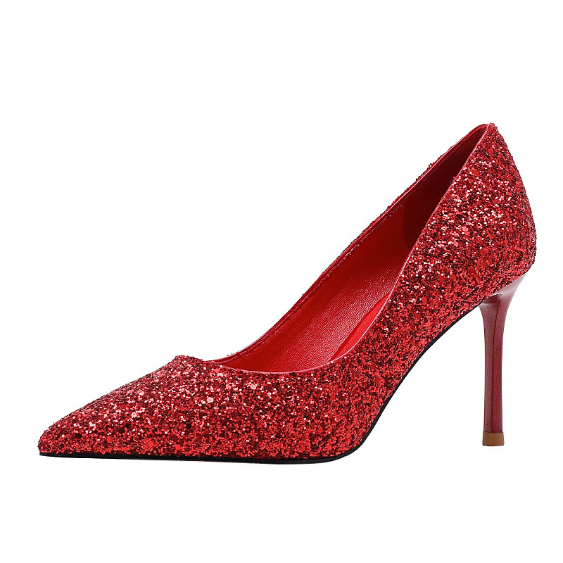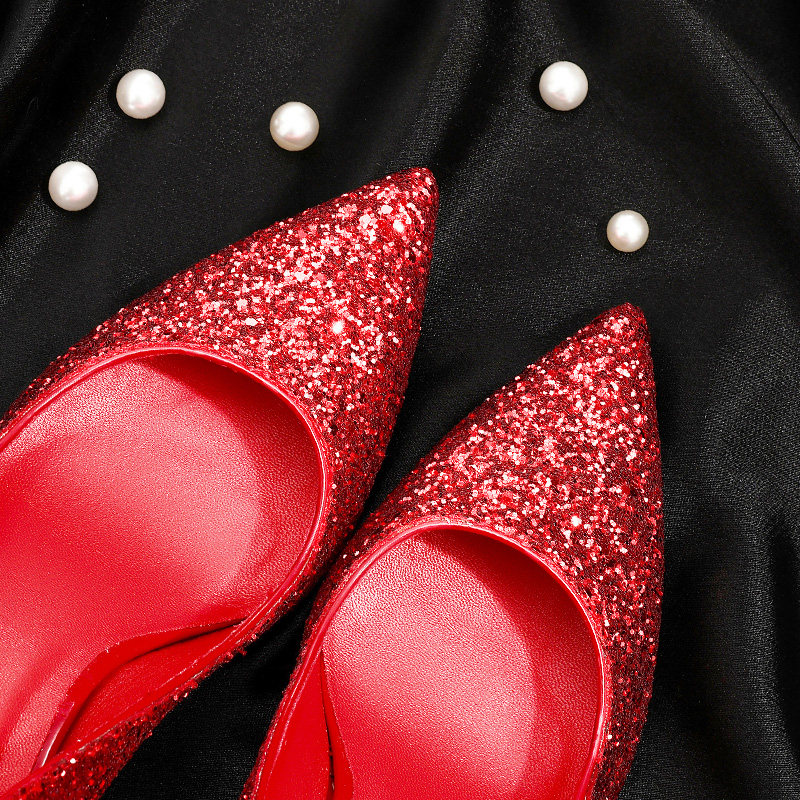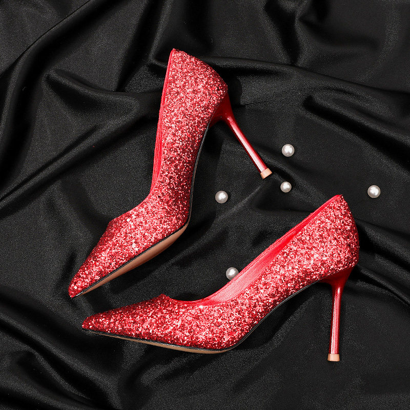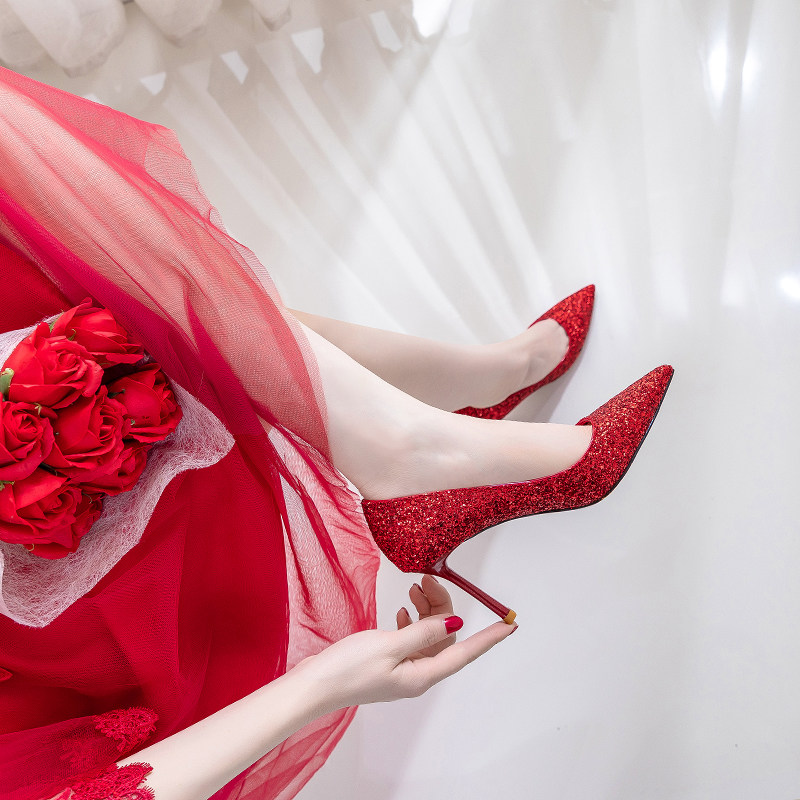Wedding shoes women 2019 new wedding dress bride Xiuhe bridesmaid shoes pointed toe stiletto single shoes red sequined high heels