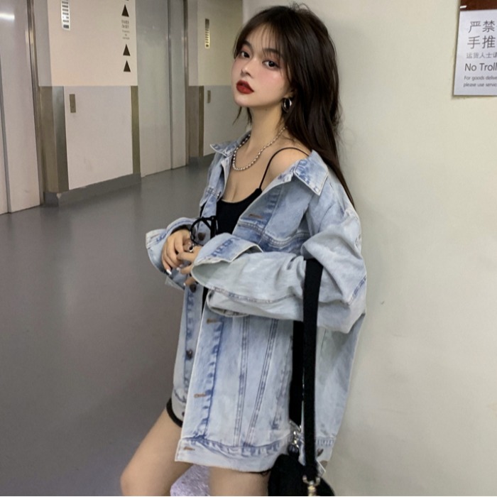 2021 Spring and autumn new Korean version retro port Wind bf long sleeve denim jacket female loose chic net red denim clothing wave