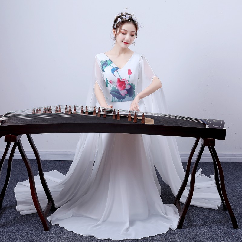 2020 new water-ink lotus ancient wind elegant and thin guzheng performance gown with long version of white water sleeve performance gown