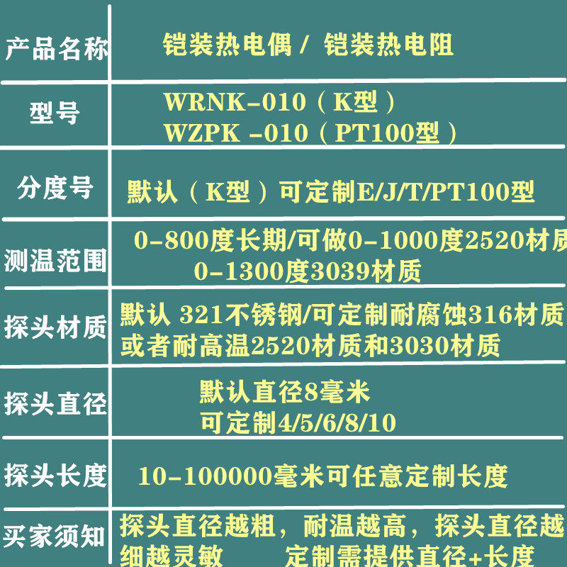 WZPK-010 armored resistance core assembled resistance core PT100 thermal resistance sensor K type 4-wire 6-wire system