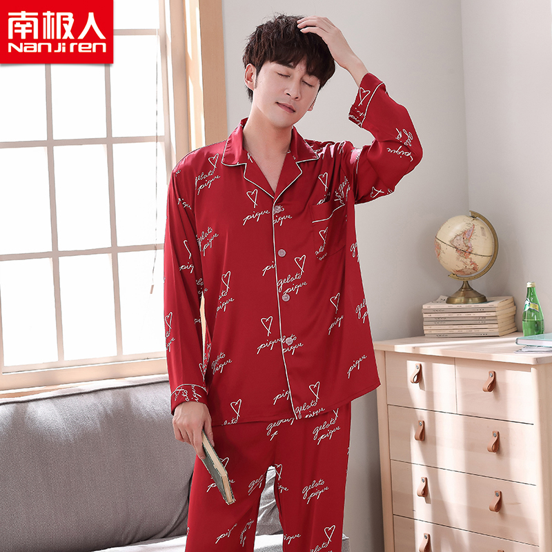 Antarctic ice silk pajamas men's long sleeve print thin cardigan men's homewear imitation silk set summer