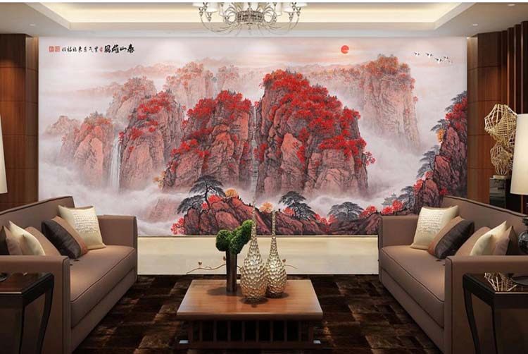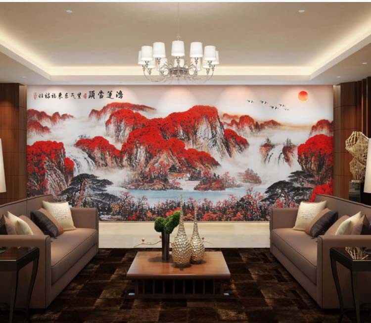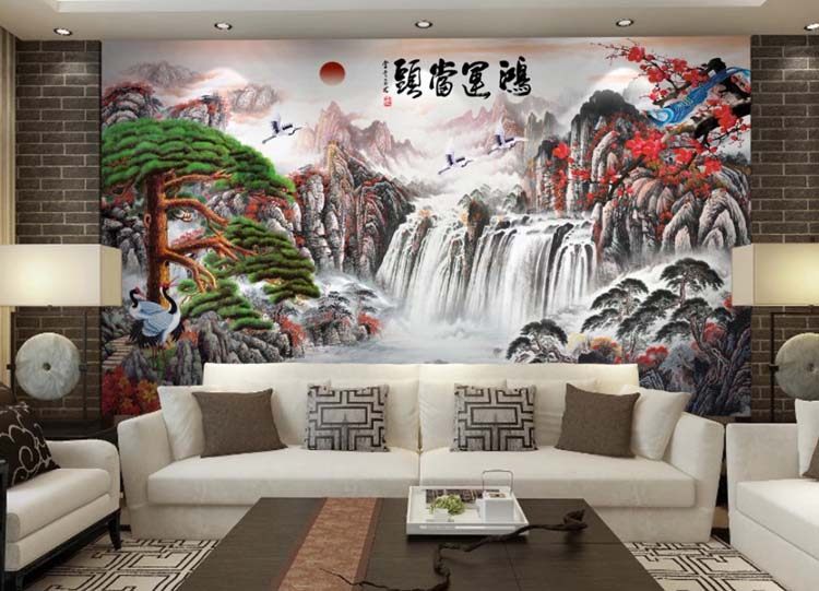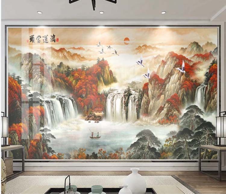 Living room tile TV sofa porch background wall New Chinese color carved microcrystal 3D Hongyun head water mountain painting