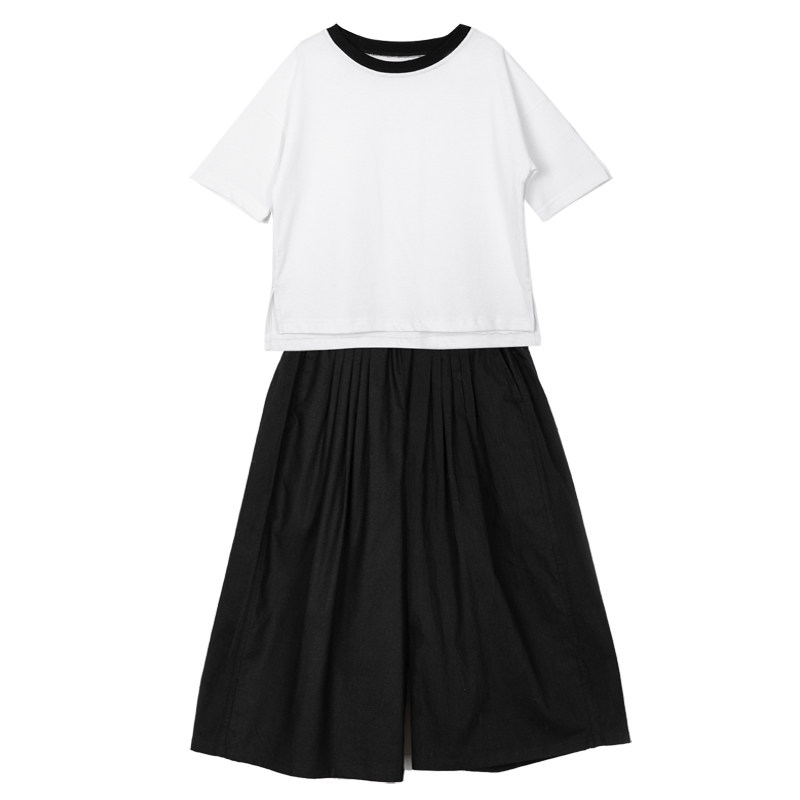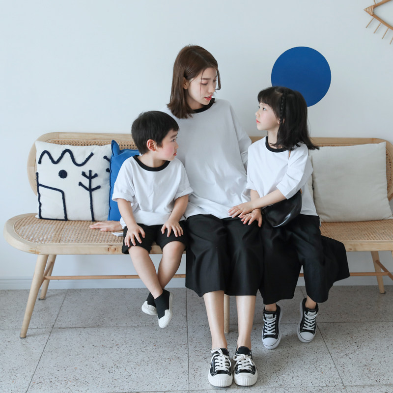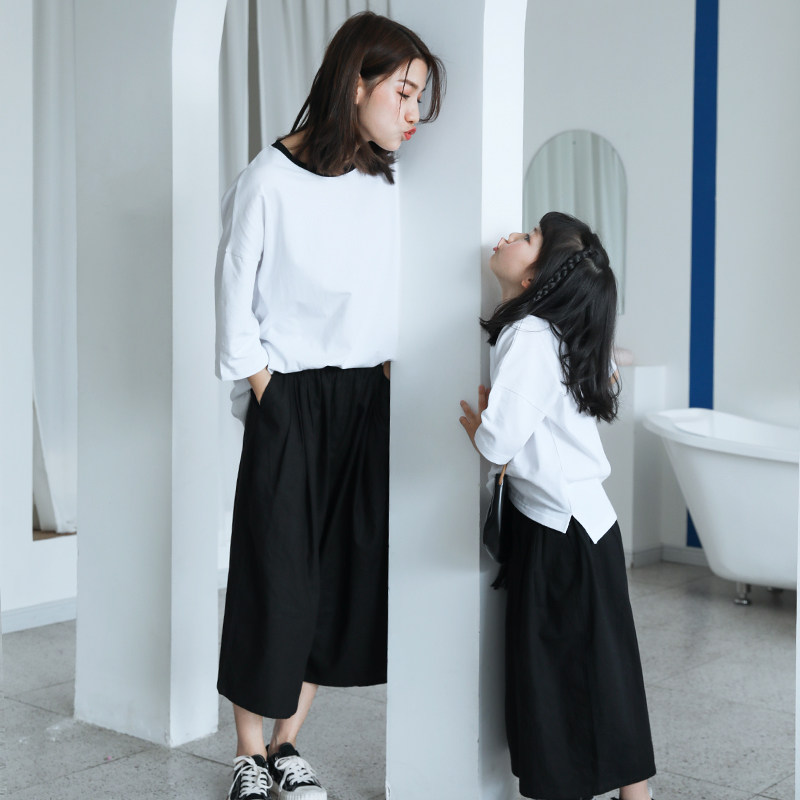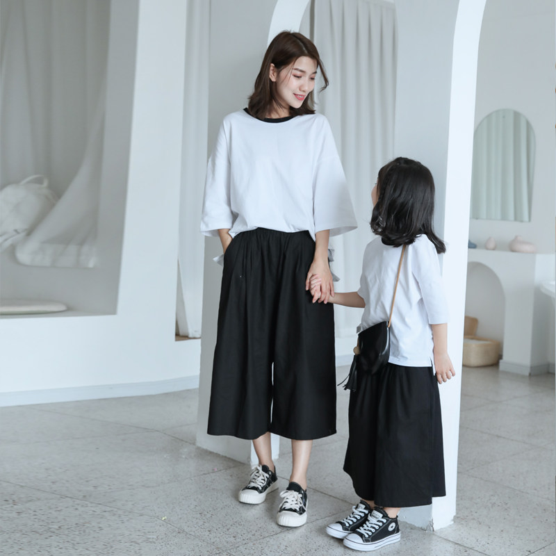 2021 summer dress loose Western style mother and daughter parent-child white cotton T-shirt black wide pants mother and child suit