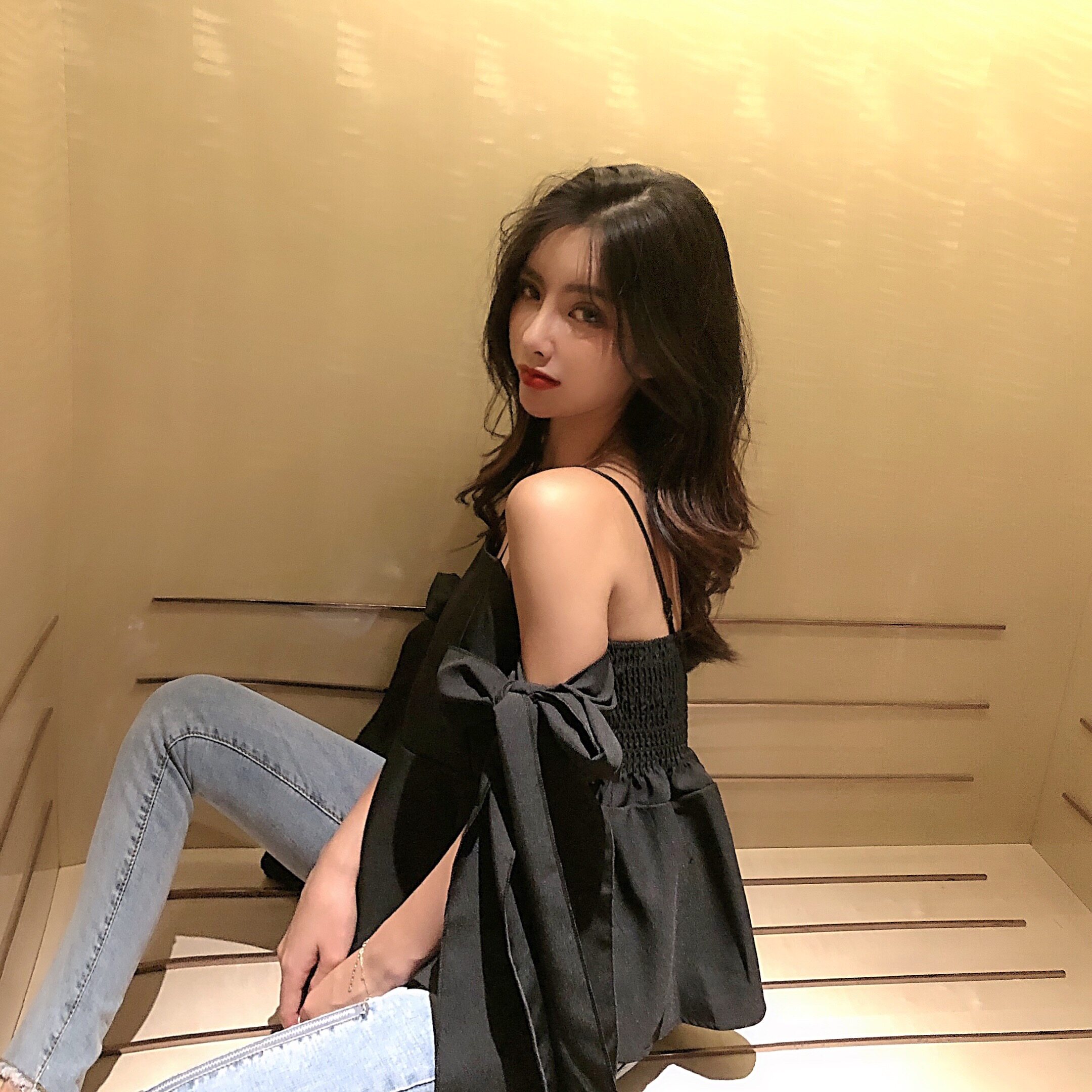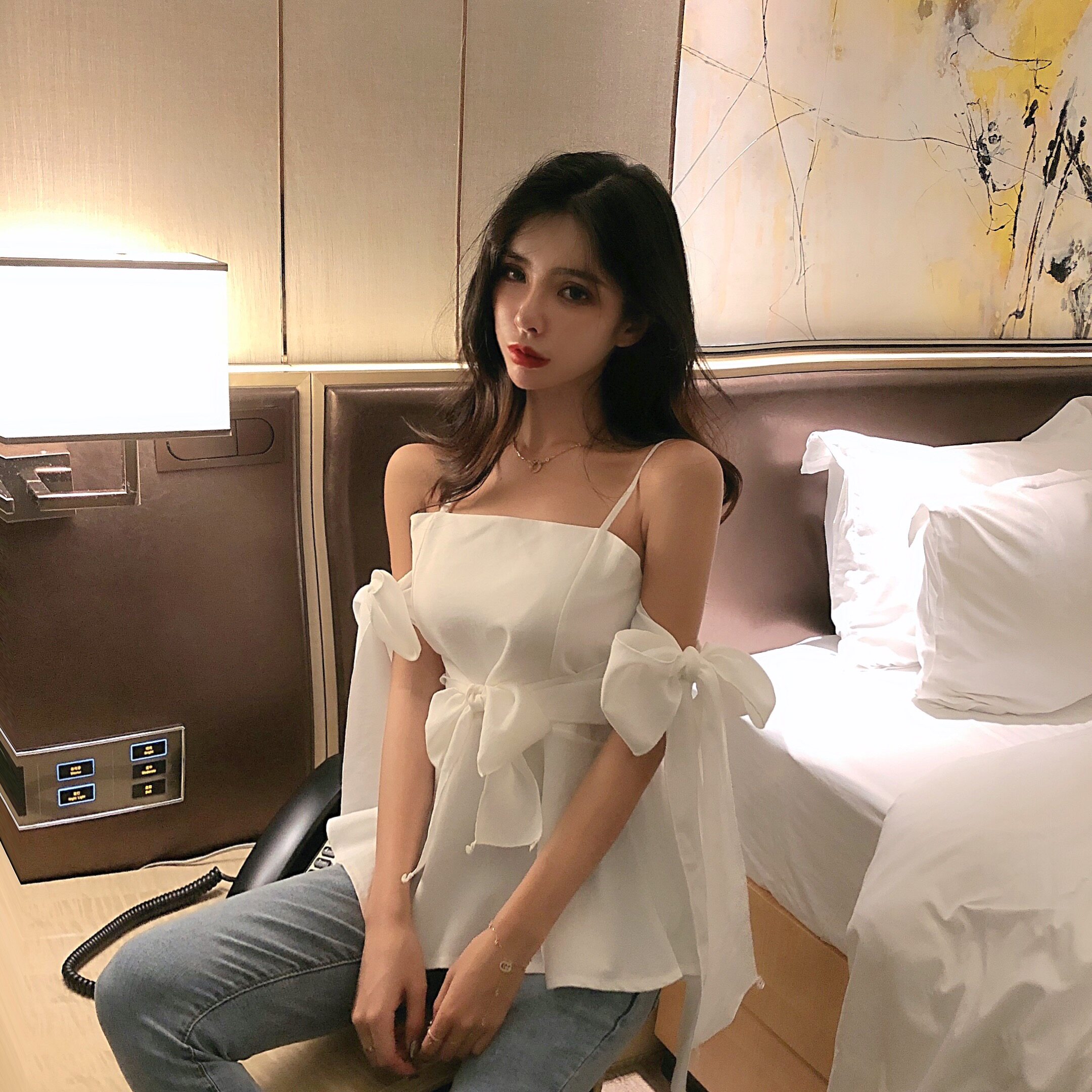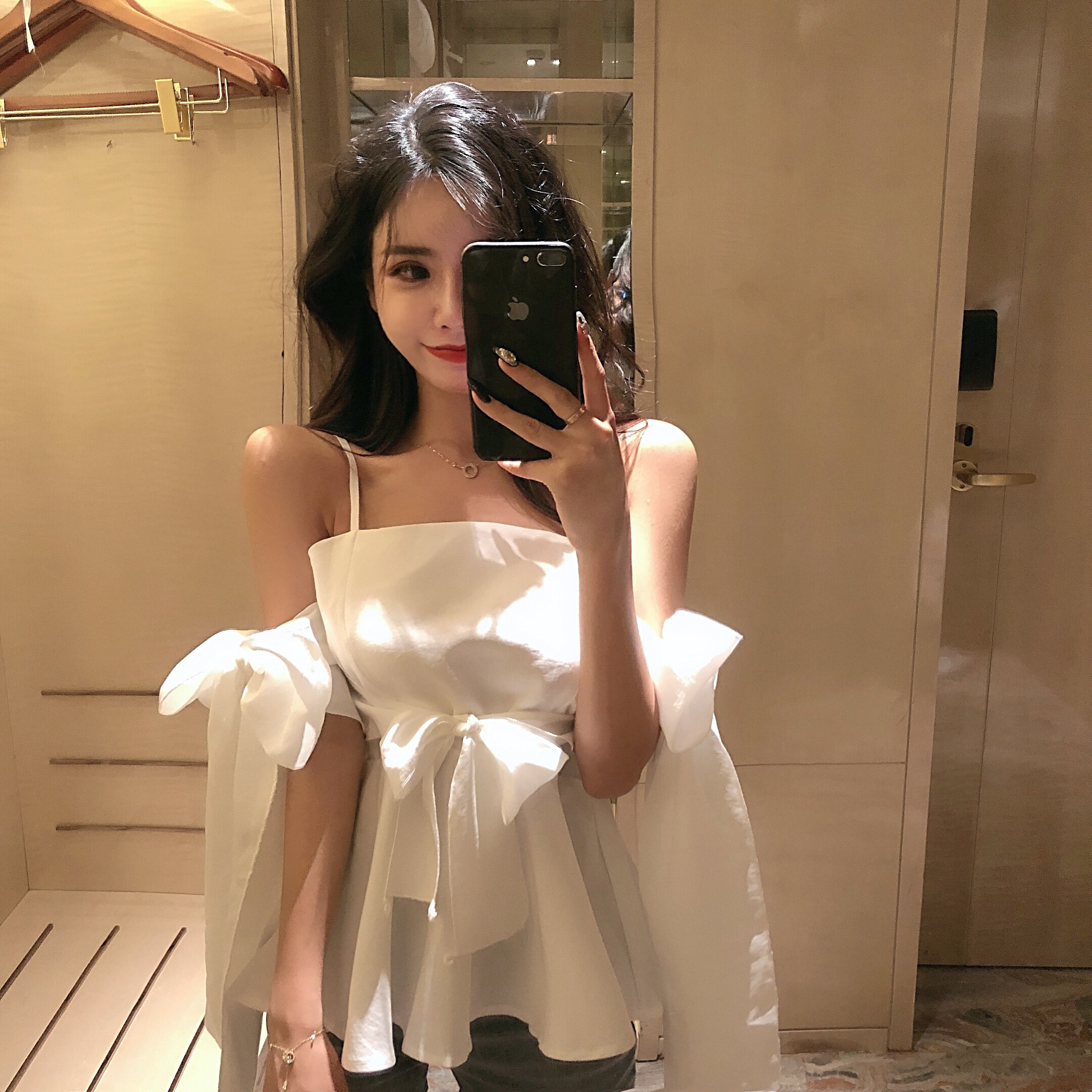 Spring and summer one word neck halter with off-the-shoulder sweet bow tie tie waist slim slim skirt hem fairy top tide