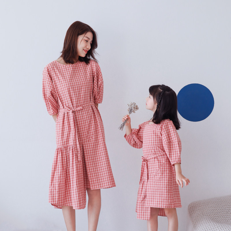 To craftsman 2021 summer new literary and foreign school original parent-child outfit mother-daughter pure cotton pink plaid dress