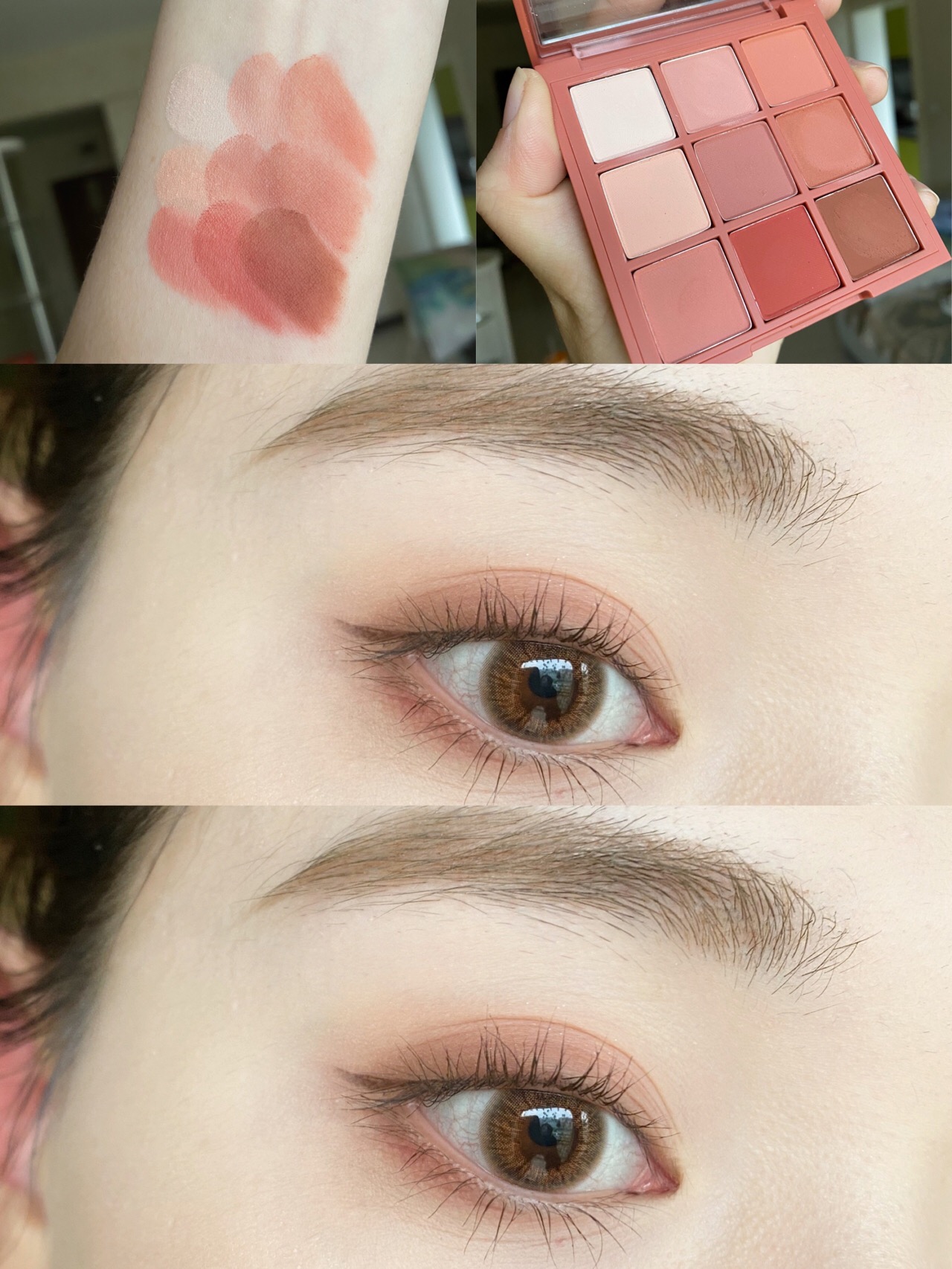 Nine-coloured eye shadow disc in the eye of the