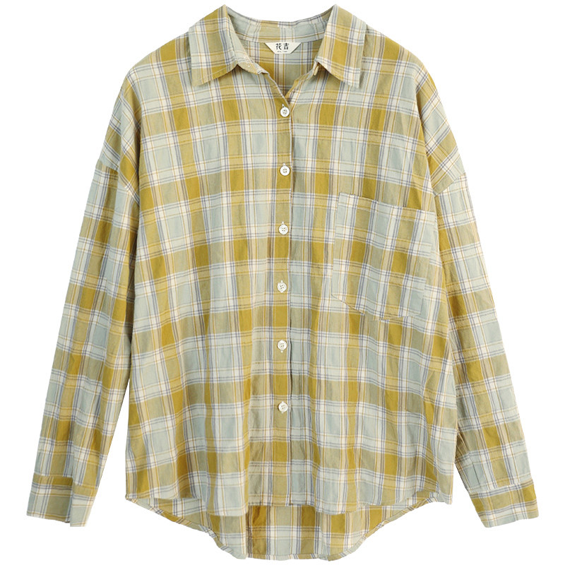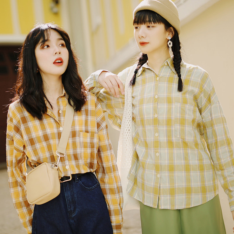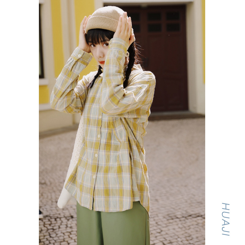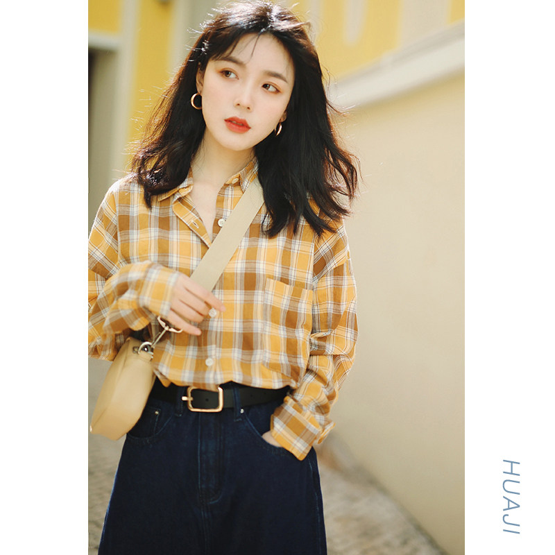 Huaji brown plaid shirt women's retro Hong Kong style spring and autumn long-sleeved 2021 spring new student shirt A396