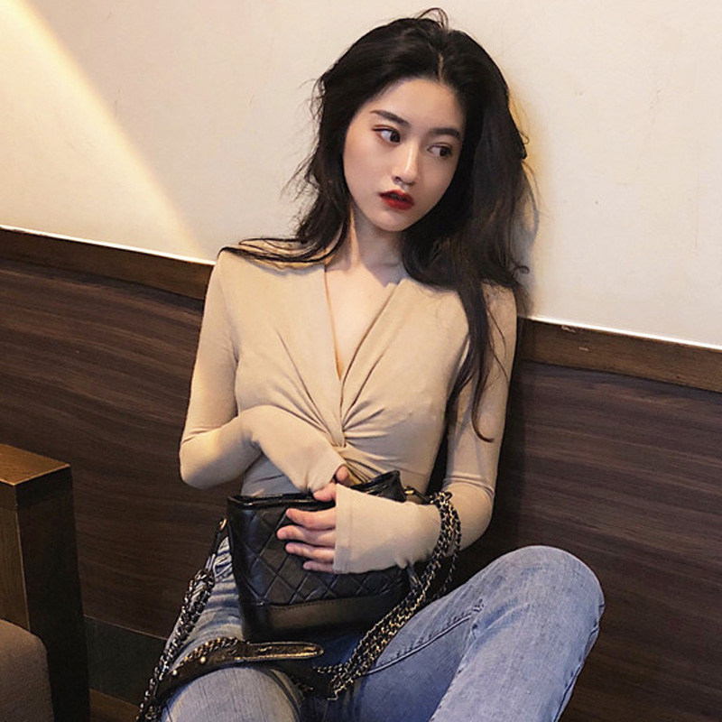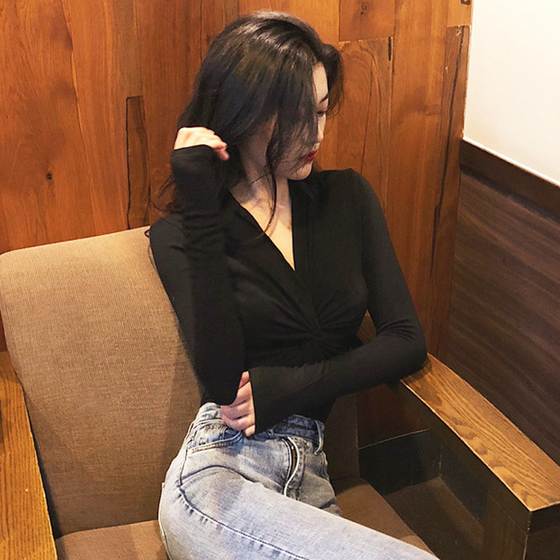 Long-sleeved t-shirt women's 2022 autumn and winter new Korean retro temperament sexy V-neck cross all-match bottoming shirt top tide