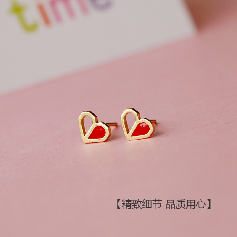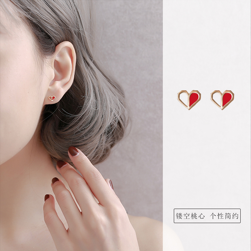 S925 sterling silver red love ear pin female temperament Korean golden hollow heart-shaped peach heart personality simple earrings