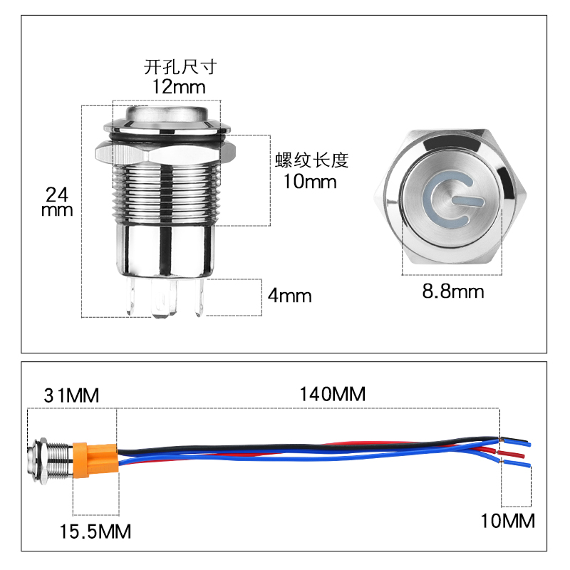 12mm socket 12mm self-locking plane without lamp 12mm self-locking high surface without lamp 12mm self-locking plane ring light Red light 5-24v12mm self-locking plane ring light Blue light 5-2