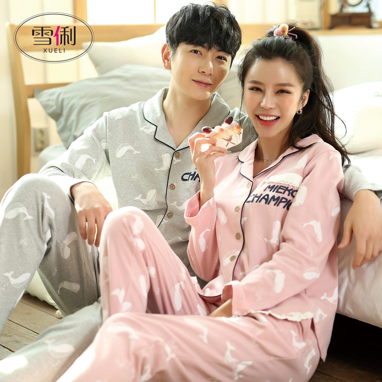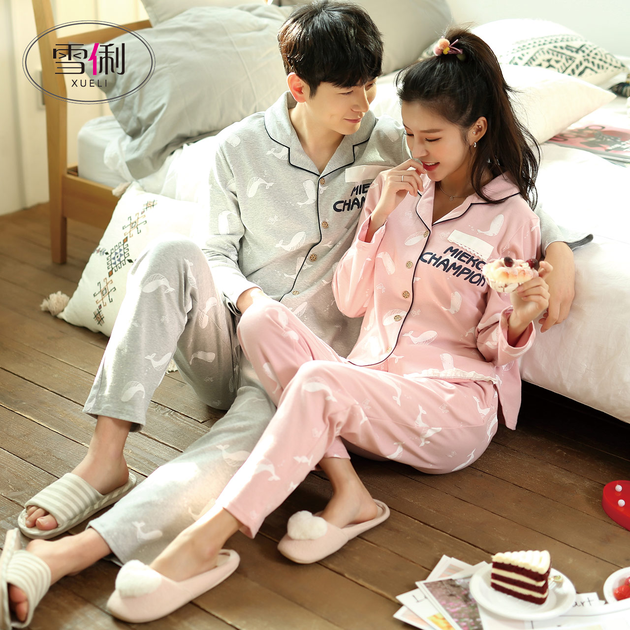 Snowy lovers sleepwear spring autumn style pure cotton long sleeves Fashion pyjamas ladies spring family conserved men's all-cotton set