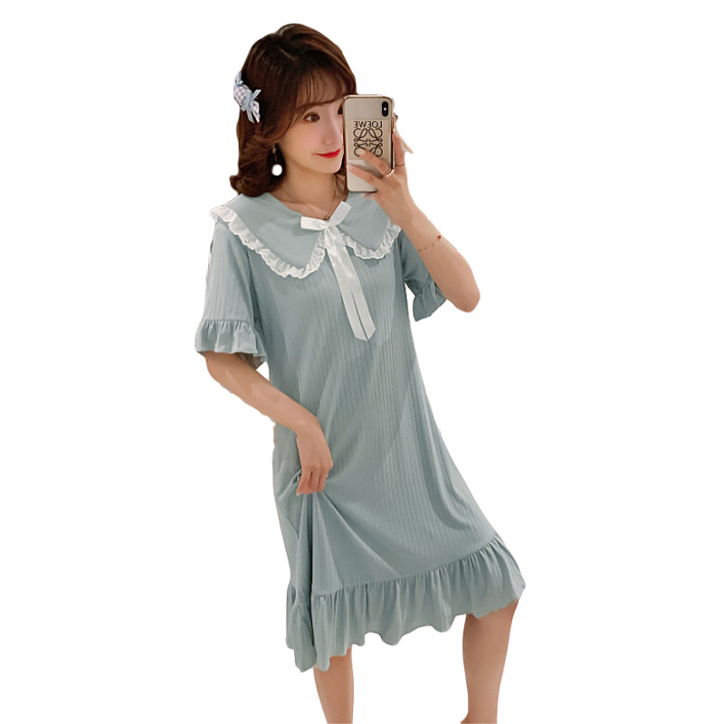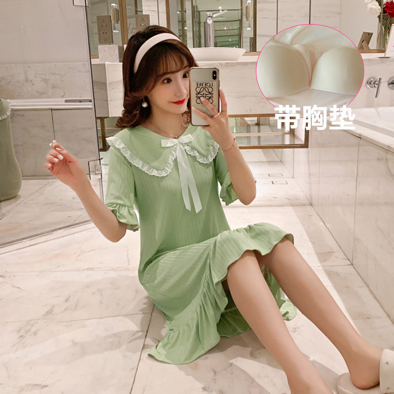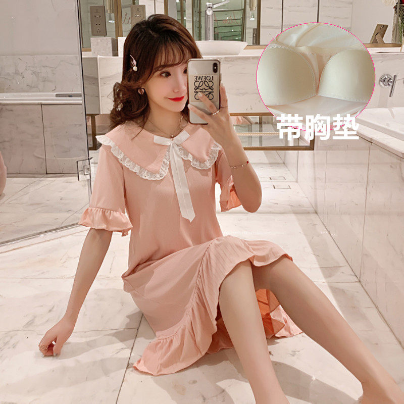 Nightdress female summer with chest pad short-sleeved pajamas maternity bathrobe sexy cute girl princess wind long knee skirt