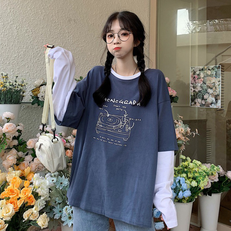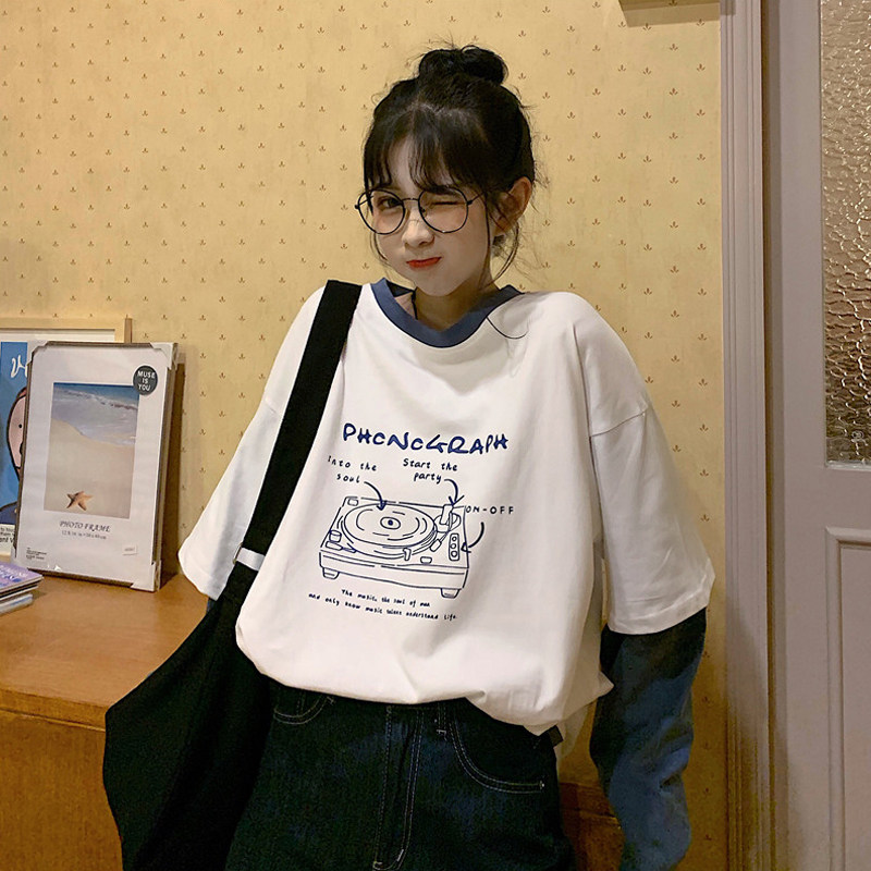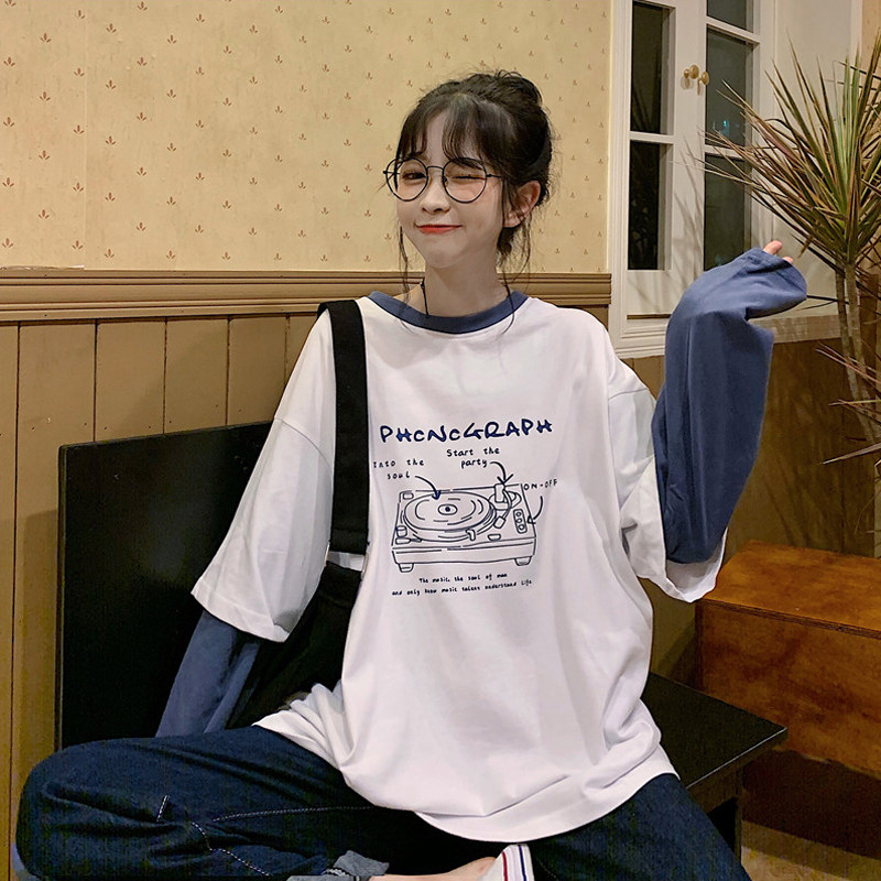 Long sleeves T-shirt adolescent girls autumn clothing 2022 new first medium-high school students Han version loose 100 lap fake two pieces of clothing